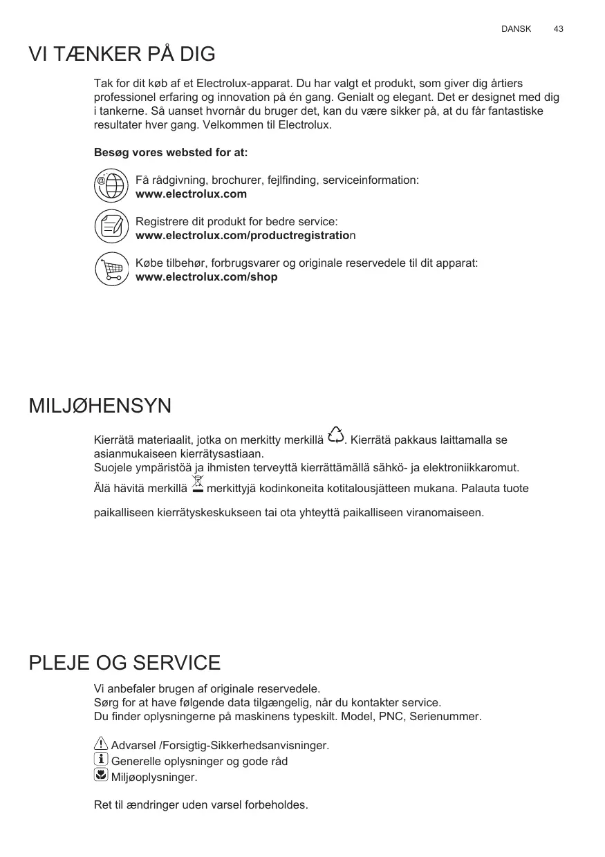 Tak for dit kôb af et Electrolux-apparat. Du har valgt et produit, som giver dig ártiers professionnel erfaring og innovation på en gang. Genialt og elegant. Det er designet med dig i tankerne. Sà uanset hvornár du bruger det, kan du være sikker på, at du fãr fantastiske resultater hver gang. Velkommen til Electrolux.