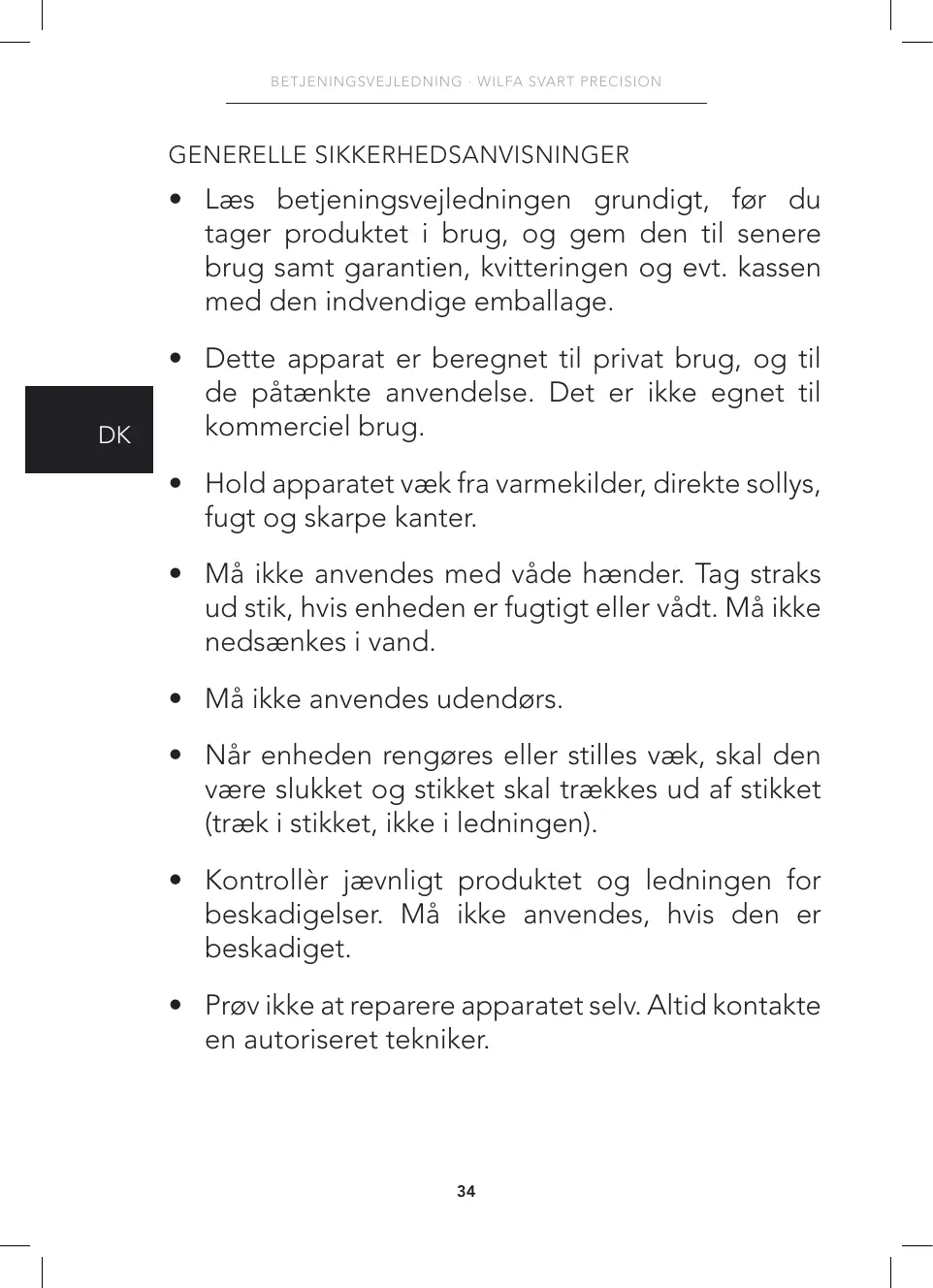 GARANTI Wilfa yder 5 års garanti på dette produkt fra købsdagen. Garantien dækker produktionsfejl eller mangler, der opstår i garantiperioden. Din kvittering fungerer som dokumentation over for forhandleren, hvis du ønsker at benytte din garanti. Garantien gælder kun for produkter, der er købt til og bruges i private husstande. Garantien gælder ikke, hvis produktet bruges kommercielt. Garantien gælder ikke, hvis produktet er misbrugt, forsømt, vejledningen fra Wilfa ikke er fulgt, produktet er ændret, eller der er foretaget uautoriseret reparation. Garantien gælder heller ikke for normalt slid på produktet, misbrug, manglende vedligeholdelse, brug af forkert spænding eller: