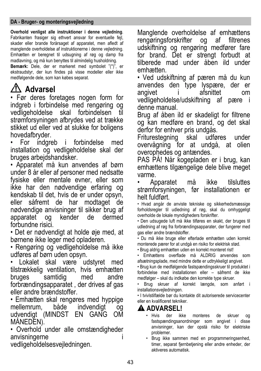 Overhold venligst alle instruktioner i dette vojledning. Fabrikanten frasiger sig ethvert ansvar for eventuelle fejl, skader eller brande forarssaget af apparatet, men afledt af manglende overholdelse af instruktionerne i dette vojledning. Emhæten er beregnet til udsugning af røg og damp fra madlavning, og mA kun benyttes til almindelig husholdning.