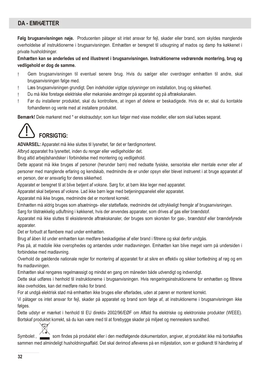 Avant toute opération de nettoyage ou d'entretien, mettez la hotte hors tension en débranchant la prise secteur ou, en cas de raccordement permanent, en désarmant le disjoncteur. Mettez des gants de protection avant d'effectuer toute opération d'installation et d'entretien. Cet appareil n'est pas prévu pour les enfants ou les personnes à capacités physiques, sensorielles ou mentales réduites ou manquant d'expérience et de connaissances. Elles ne pourront l'utiliser que sous la surveillance d'un adulte responsable de leur sécurité et après avoir été mises au courant de son fonctionnement. La hotte est prévue pour des adultes. Surveillez les enfants afin qu'ils ne jouent pas avec l'appareil ou avec ses commandes. Ne mettez jamais la hotte en marche si la grille n'est pas bien en place. Ne déposez AUCUN objet sur la hotte sauf si cela est expressément autorisé. Quand la hotte fonctionne en même temps que d'autres appareils à gaz ou autres combustibles, la cuisine doit disposer d'une ventilation suffisante. L'air aspiré par la hotte ne doit jamais être expulsé dans le conduit d'évacuation des fumées de combustion dégagées par des appareils fonctionnant au gaz ou autres combustibles. Il est formellement interdit de flamber les aliments sous la hotte. Évitez de laisser brûler une flamme nue sous la hotte, car cela peut endommager les filtres et provoquer un incendie. Surveillez vos fritures en permanence, car la graisse ou l'huile surchauffée peut prendre feu. Les parties accessibles de la hotte peuvent devenir assez chaudes quand les appareils de cuisson sont en marche. En ce qui concerne les mesures techniques de sécurité pour l'évacuation des fumées, respectez strictement les réglementations et normes en vigueur dans votre pays. La hotte doit être régulièrement nettoyée, aussi bien à l'intérieur qu'à l'extérieur (AU MOINS UNE FOIS PAR MOIS), et ceci en respectant les instructions d'entretien fournies dans ce manuel. Le non-respect des consignes concernant le nettoyage de la hotte ainsi que le remplacement et le nettoyage des filtres peut entraîner un risque d'incendie. Afin d'éviter tout risque de choc électrique, n'utilisez pas la hotte si les lampes ne sont pas bien en place. Nous déclinons toute responsabilité pour tout dysfonctionnement, dommage ou incendie résultant du non-respect des consignes figurant dans cette notice.