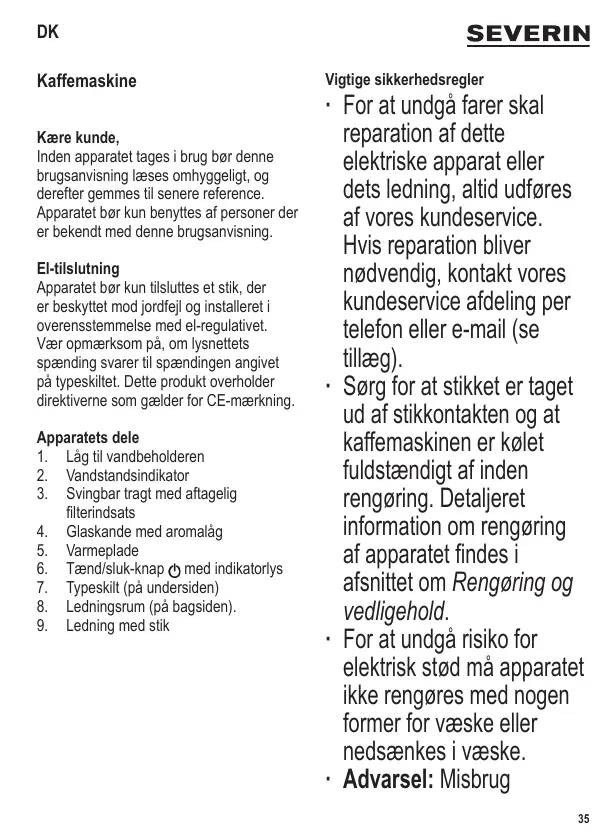 Kaffemaskine Kære kunde, Inden apparatet tages i brug bør denne brugsanvisning læses omhyggeligt, og derefter gemmes til senere reference. Apparatet bør kun benyttes af personer der er bekendt med denne brugsanvisning. El-tilslutning Apparatet bør kun tilsluttes et stik, der er beskyttet mod jordfejl og installeret i overensstemmelse med el-regulativet. Vær opmærksom på, om lysnettets spænding svarer til spændingen angivet på typeskiltet. Dette produkt overholder direktiverne som gælder for CE-mærkning. Apparatets dele