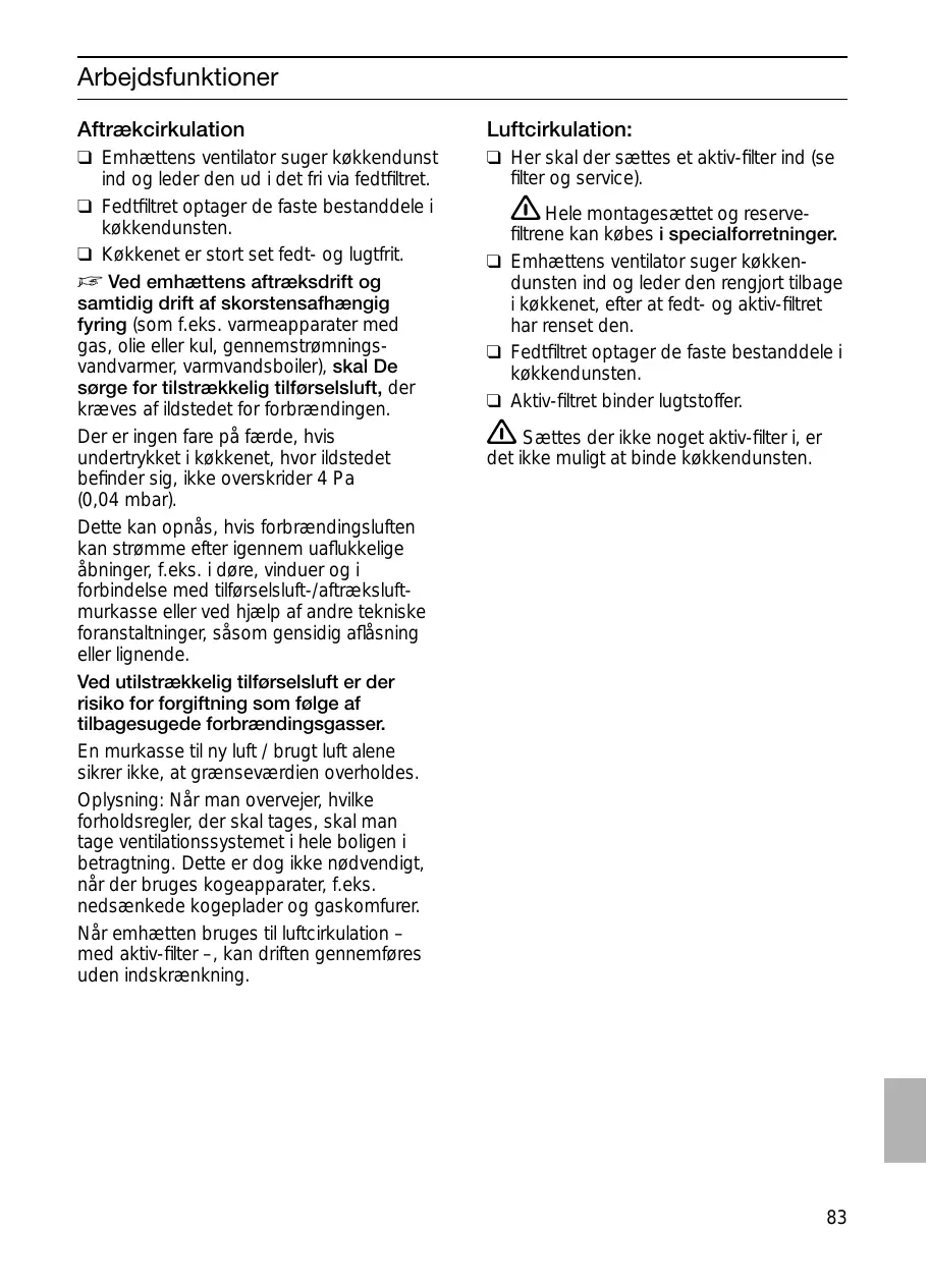 ❑ Ce filtre retient les particules grasses solides en suspension dans les buées de cuisson. ❑ Les particules grasses ne se déposent plus dans la cuisine, les odeurs de cuisson disparaissent. D Si la hotte évacue l'air à l'extérieur et si le logement comporte des moyens de chauffage (tels par ex. des appareils de chauffage au gaz, au fuel ou au charbon, chauffe-eau instantanés ou à accumulation) raccordés à une cheminée, veiller impérativement à ce que l'apport d'air soit suffisant pour assurer la marche du chauffage à combustion. Un fonctionnement sans risque est possible si la dépression dans le local où le foyer de chauffage est implanté ne dépasse pas 4 Pascals (0,04 mbars).On y parvient en présence d'ouvertures non obturables ménagées par ex. dans les portes, fenêtres et en association avec des ventouses télescopiques d'admission/ évacuation de l'air à travers la maçonnerie ou par d'autres mesures techniques telles qu'un verrouillage réciproque ou assimilé permettant à l'air d'affluer pour assurer la combustion. En cas d'afflux d'air insuffisant, risque d'intoxication par réaspiration des gaz de combustion. La présence d'une ventouse télescopique d'apport et d'évacuation d'air ne suffit pas à assurer le respect de la valeur limite. Remarque: lors de l'évaluation de la situation, toujours tenir compte de l'ensemble des moyens d'aération du logement. Cette règle ne vaut généralement pas si vous utilisez des appareils de cuisson (table de cuisson et cuisinière à gaz). Si la hotte recycle l'air aspiré au moyen d'un filtre au charbon actif, son fonctionnement ne s'assortit d'aucune restriction.