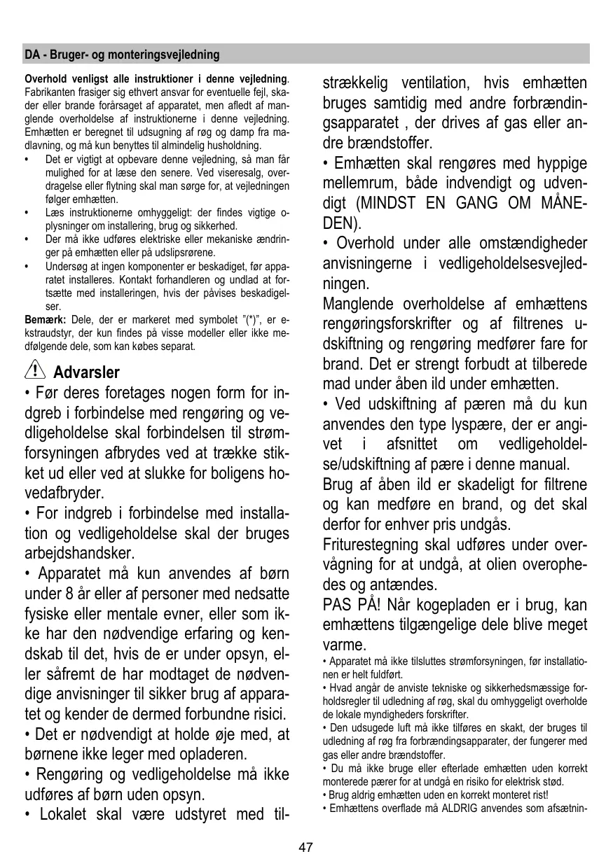 Montagevoorschriften en gebruiksaanwijzingen Montage- und Gebrauchsanweisung Asennus- ja käyttöohjeet Monterings- och bruksanvisningar • Para la sustitución de la lámpara sólo utilizar el tipo de lámpara indicado en la sección de mantenimiento/sustitución de este manual. El uso de una llama libre es perjudicial para los filtros y puede provocar incendios, por lo tanto, debe evitarse en cualquier caso. Los fritos debe realizarse con cuidado para evitar que el aceite caliente prenda fuego. ATENCIÓN: Cuando la placa de cocción está funcionando las partes accesibles de la campana pueden calentarse.
