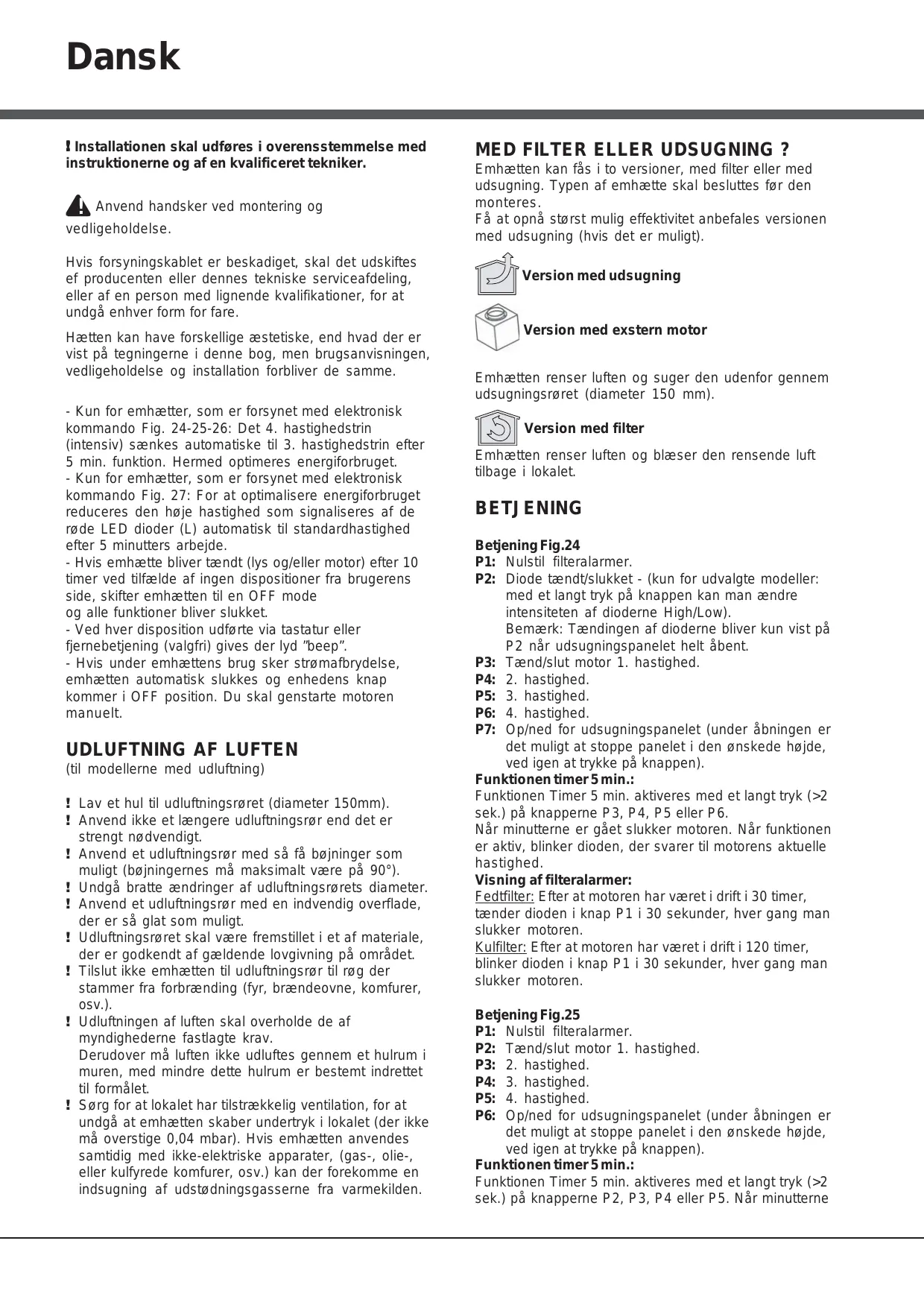 Hætten kan have forskellige æstetiske, end hvad der er vist på tegningerne i denen bog, men brugsanvisningen, vedligeholdelse og installation forbliver de samme.