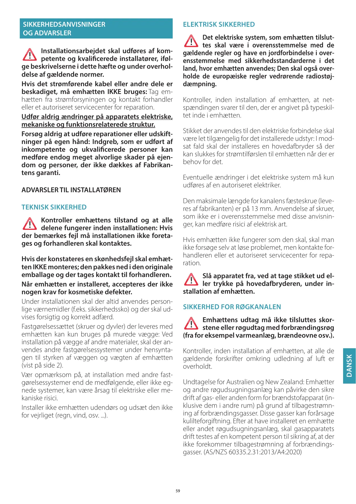 Kontroller, inden installation af emhætten, at alle de gældende forskrifter omkring udledning af luft er overholdt. Undtagelse for Australien og New Zealand: Emhætter og andre røgudsugningsanlæg kan påvirke den sikre drift af gas- eller anden form for brændstofapparat (inklusive dem i andre rum) på grund af tilbagestrømning af forbrændingsgasser. Disse gasser kan forårsage kulilteforgiftning. Efter at have installeret en emhætte eller andet røgudsugningsanlæg, skal gasapparatets drift testes af en kompetent person til sikring af, at der ikke forekommer tilbagestrømning af forbrændingsgasser. (AS/NZS 60335.2.31:2013/A4:2020)