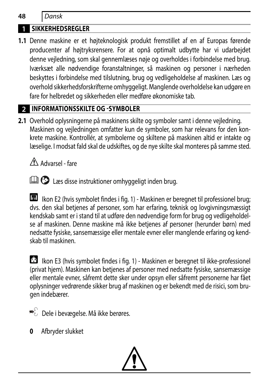 EN 62233; EN 50581 Sen henkilön nimi ja osoite, joka on valtuutettu kokoamaan teknisen eritelmän: Stefano Reverberi / AR Toimitusjohtaja Via M.L. King 3 - 41122 Modena, Italia Direktiivissä 2000/14/EY vaadittu vaatimustenmukaisuuden arviointimenettely on toteutettu liitteen V mukaan. Mallinro 2.1 Respecter les pictogrammes de sécurité et les symboles figurant sur l'appareil et dans ce manuel. Seuls les symboles concernant l'appareil acheté sont reproduits sur l'appareil et dans le manuel. S'assurer que les symboles et les pictogrammes de sécurité sur l'appareil sont lisibles et en bon état. Dans le cas contraire, les remplacer en respectant la position d'origine. Attention - Danger Lire attentivement ces instructions avant emploi. Icône E2 (si le symbole est présent sur fig. 1) - Elle indique que l'appareil est conçu pour un usage professionnel, c'est-à-dire pour les personnes qui ont de l'expérience, la connaissance technique, normative, législative et qui sont en mesure d'exécuter les opérations nécessaires à l'utilisation et à la maintenance de l'appareil. Cet appareil ne doit pas être utilisé par des personnes (enfants inclus) dont les capacités physiques, sensorielles ou mentales sont réduites, ou par des personnes sans expérience ni formation. Icône E3 (si le symbole est présent sur fig. 1) - Elle indique que l'appareil est conçu pour un usage non professionnel (domestique). Il peut être utilisé par des personnes aux capacités physiques, sensorielles ou mentales réduites, ou manquant d'expérience ou de connaissance, à partir du moment où elles sont surveillées ou ont reçu des explications permettant d'utiliser l'appareil en toute sécurité et comprennent les risques impliqués. Organes en mouvement. Ne pas toucher.