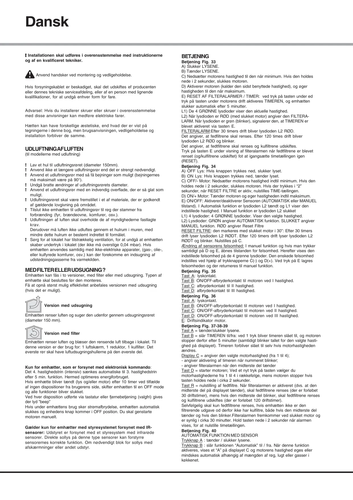 ! Sørg for at lokalet har tilstrækkelig ventilation, for at undgå at emhaeten skaber undertryk i lokalet (der ikke må overstige 0,04 mbar). Hvis emhaeten anwendes samtidig med jegke-elektriske apparater, (gas-, olie-, eller kufyrede komfurer, osv.) kan der foreverkommen en indsugning af udstodningsgasserne fra varmekilden.
