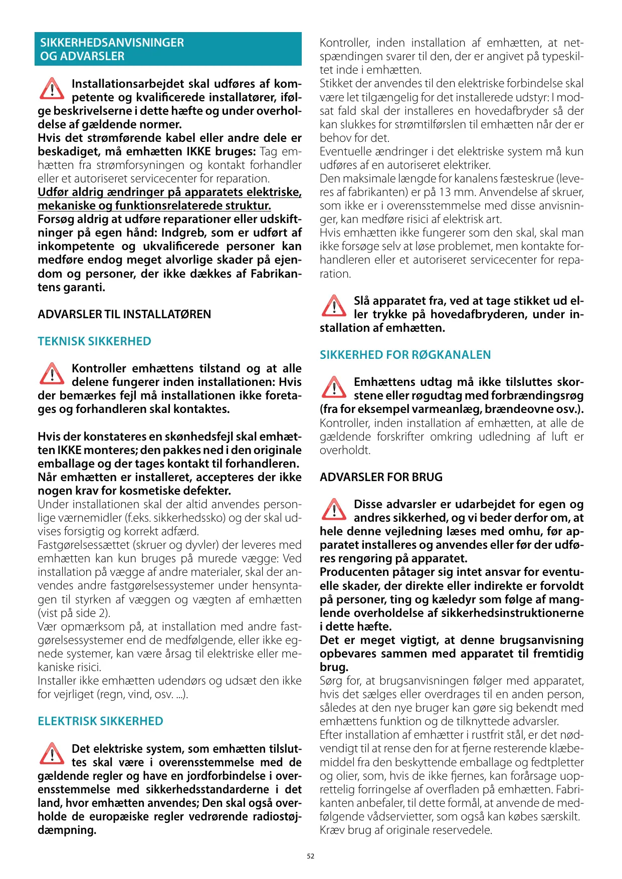 Disse advarsler er udarbejdet for egen og andres sikkerhed, og vi beder derfor om, at hele denne vejledning læses med omhu, før apparatet installeres og anvendes eller før der udføres rengøring på apparatet. Producenten påtager sig intet ansvar for eventuelle skader, der direkte eller indirekte er forvoldt på personer, ting og kæledyr som følge af manglende overholdelse af sikkerhedsinstruktionerne i dette hæfte. Det er meget vigtigt, at denne brugsanvisning opbevares sammen med apparatet til fremtidig brug. Sørg for, at brugsanvisningen følger med apparatet, hvis det sælges eller overdrages til en anden person, således at den nye bruger kan gøre sig bekendt med emhættens funktion og de tilknyttede advarsler. Efter installation af emhætter i rustfrit stål, er det nødvendigt til at rense den for at fjerne resterende klæbemiddel fra den beskyttende emballage og fedtpletter og olier, som, hvis de ikke fjernes, kan forårsage uoprettelig forringelse af overfladen på emhætten. Fabrikanten anbefaler, til dette formål, at anvende de medfølgende vådservietter, som også kan købes særskilt. Kræv brug af originale reservedele. ELEKTRISK SIKKERHED Det elektriske system, som emhætten tilsluttes skal være i overensstemmelse med de gældende regler og have en jordforbindelse i overensstemmelse med sikkerhedsstandarderne i det land, hvor emhætten anvendes; Den skal også overholde de europæiske regler vedrørende radiostøjdæmpning.