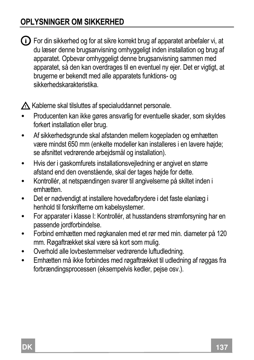 Il est important que les utilisateurs connaissent toutes les caractéristiques de fonctionnement et de sécurité de l’appareil. La connexion des câbles doit être effectuée par un technicien compétent. • En aucun cas le fabricant ne peut être tenu pour responsable d’éventuels dommages dus à une installation ou à une utilisation impropre. • La distance de sécurité minimum entre le plan de cuisson et la hotte aspirante est de 650 mm (certains modèles peuvent être installés à une hauteur inférieure ; voir le paragraphe concernant les dimensions de travail et l’installation). • Si les instructions d’installation du plan de cuisson à gaz spécifient une distance supérieure à celle indiquée ci-dessus, veuillez impérativement en tenir compte. • Assurez-vous que la tension du secteur correspond à celle indiquée sur la plaque des caractéristiques apposée à l’intérieur de la hotte. • Les dispositifs de sectionnement doivent être montés dans l’installation fixe conformément aux normes sur les systèmes de câblage. • Pour les appareils de Classe I, s’assurer que l’installation électrique de votre intérieur dispose d’une mise à la terre adéquate. • Reliez l’aspirateur du conduit de cheminée avec un tube ayant un diamètre minimum de 120 mm. Le parcours des fumées doit être le plus court possible. • Respecter toutes les normes concernant l’évacuation de l’air. • Ne reliez pas la hotte aspirante aux conduits de cheminée qui acheminent les fumées de combustion (par ex. de chaudières, de cheminées, etc.).