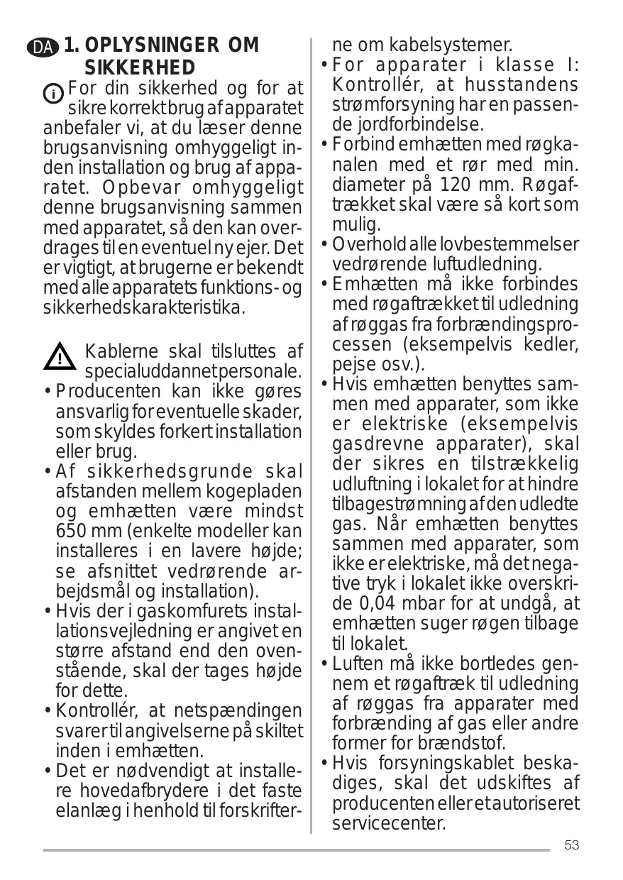 • Pour les appareils de Classe I, s’assurer que l’installation électrique de votre intérieur dispose d’une mise à la terre adéquate. Reliez l’aspirateur du conduit de cheminée avec un tube ayant XQ GLDPqWUH PLQLPXP GH mm. Le parcours des fumées doit être le plus court possible. Respecter toutes les normes concernant l’évacuation de l’air. Ne reliez pas la hotte aspirante aux conduits de cheminée qui acheminent les fumées de comEXVWLRQ SDUH[GHFKDXGLqUHV de cheminées, etc.). Si vous utilisez l’aspirateur en même temps que des appareils non électriques (par ex. fonctionnant au gaz), veillez à ce que la SLqFHVRLWDGpTXDWHPHQWYHQWLOpH D¿Q G¶HPSrFKHU OH UHWRXU GX ÀX[ GHV JD] G¶pYDFXDWLRQ Si vous utilisez la hotte de cuisine en même temps que des appareils non alimentés à l’électricité, la pression négative dans ODSLqFHQHGRLWSDVGpSDVVHU PEDUD¿QG¶pYLWHUTXHOHV fumées soient réaspirées dans ODSLqFHRVHWURXYHODKRWWH Ne pas évacuer l’air à travers 13