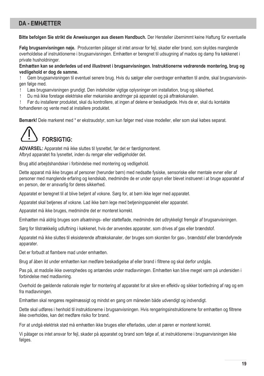 DA - EMHÆTTER Bitte befolgen Sie strikt die Anweisungen aus diesem Handbuch. Der Hersteller übernimmt keine Haftung für eventuelle Følg brugsanvisningen nøje. Producenten påtager sit intet ansvar for fejl, skader eller brand, som skyldes manglende overholdelse af instruktionerne i brugsanvisningen. Emhætten er beregnet til udsugning af mados og damp fra køkkenet i private husholdninger. Emhætten kan se anderledes ud end illustreret i brugsanvisningen. Instruktionerne vedrørende montering, brug og vedligehold er dog de samme. ! Gem brugsanvisningen til eventuel senere brug. Hvis du sælger eller overdrager emhætten til andre, skal brugsanvisningen følge med. ! Læs brugsanvisningen grundigt. Den indeholder vigtige oplysninger om installation, brug og sikkerhed. ! Du må ikke foretage elektriske eller mekaniske ændringer på apparatet og på aftrækskanalen. ! Før du installerer produktet, skal du kontrollere, at ingen af delene er beskadigede. Hvis de er, skal du kontakte forhandleren og vente med at installere produktet. Bemærk! Dele markeret med * er ekstraudstyr, som kun følger med visse modeller, eller som skal købes separat.