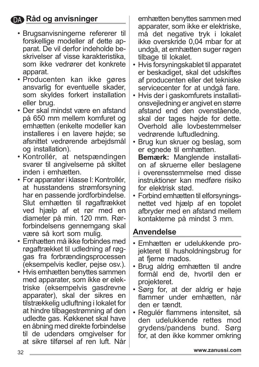 Anvendelse • Emhætten er udelukkende projekteret til husholdningsbrug for at fjerne mados. • Brug aldrig emhætten til andre formål end de, hvortil den er projekteret. • Sørg for, at der aldrig er høje flammer under emhætten, når den er tændt. • Regulér flammens intensitet, så den udelukkende rettes mod grydens/pandens bund. Sørg for, at den ikke kommer omkring www.zanussi.com