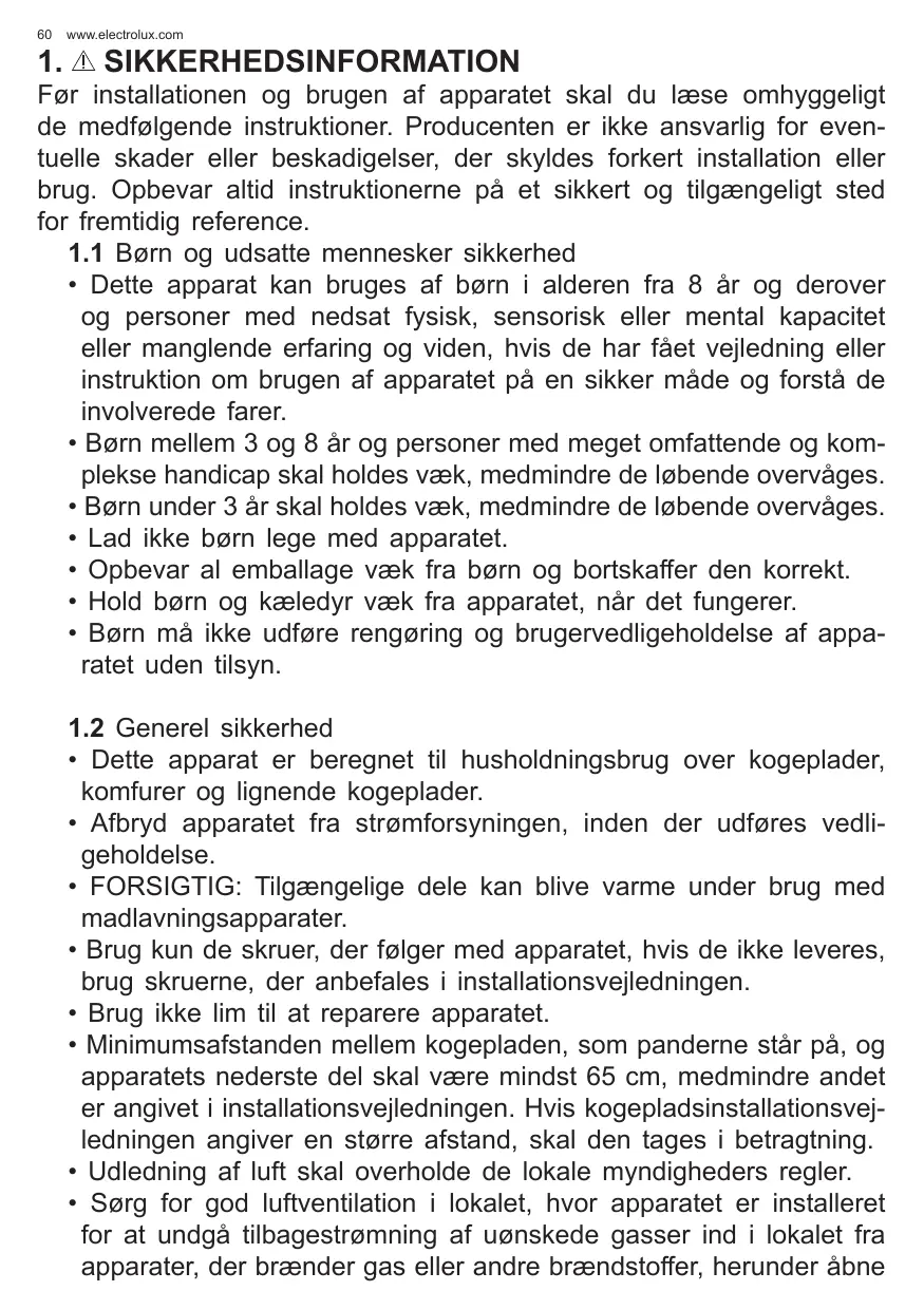 • Les enfants ne doivent pas utiliser l’appareil en tant que jouet. • Protégez les emballages des enfants et éliminez-les de manière appropriée. • Les enfants et les animaux domestiques ne doivent pas avoir accès à l’appareil en état de fonctionnement. • Les enfants ne doivent pas effectuer le nettoyage ou l’entretien de l’appareil sans surveillance. 1.2 Règles générales de sécurité • L’appareil est destiné à un usage domestique, au-dessus des fours, cuisinières et autres appareils de cuisson similaires. • Avant d’effectuer tout travail de maintenance, l’appareil doit être déconnecté de l’alimentation électrique. • AVERTISSEMENT : Les parties auxquelles l’accès peut être obtenu peuvent devenir chaudes pendant l’utilisation avec des appareils de cuisson. • Utilisez uniquement les vis de montage fournies avec l’appareil; si elles n’ont pas été livrées, utilisez les vis recommandées dans la notice d’installation. • N’utilisez pas d’adhésifs pour fixer l’appareil. • La distance minimale entre la surface de la plaque de cuisson sur laquelle se trouvent les ustensiles de cuisson et la partie inférieure de l’appareil doit être de 65 cm, sauf indication contraire dans la notice d’installation. Si une plus grande distance a été spécifiée dans la notice d’installation de la plaque de cuisson, cela doit être pris en compte.