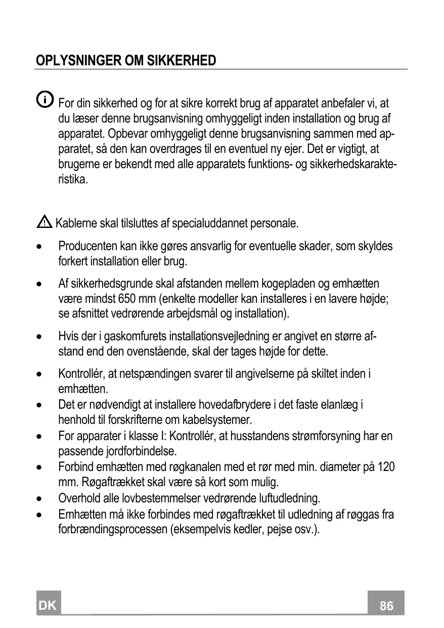 La distance de sécurité minimum entre le plan de cuisson et la hotte aspirante est de 650 mm (certains modèles peuvent être installés à une hauteur inférieure ; voir le paragraphe concernant les dimensions de travail et l’installation). Si les instructions d’installation du plan de cuisson à gaz spécifient une distance supérieure à celle indiquée ci-dessus, veuillez impérativement en tenir compte. Assurez-vous que la tension du secteur correspond à celle indiquée sur la plaque des caractéristiques apposée à l’intérieur de la hotte. Les dispositifs de sectionnement doivent être montés dans l’installation fixe conformément aux normes sur les systèmes de câblage. Pour les appareils de Classe I, s’assurer que l’installation électrique de votre intérieur dispose d’une mise à la terre adéquate. Reliez l’aspirateur du conduit de cheminée avec un tube ayant un diamètre minimum de 120 mm. Le parcours des fumées doit être le plus court possible. Respecter toutes les normes concernant l’évacuation de l’air. Ne reliez pas la hotte aspirante aux conduits de cheminée qui acheminent les fumées de combustion (par ex. de chaudières, de cheminées, etc.).