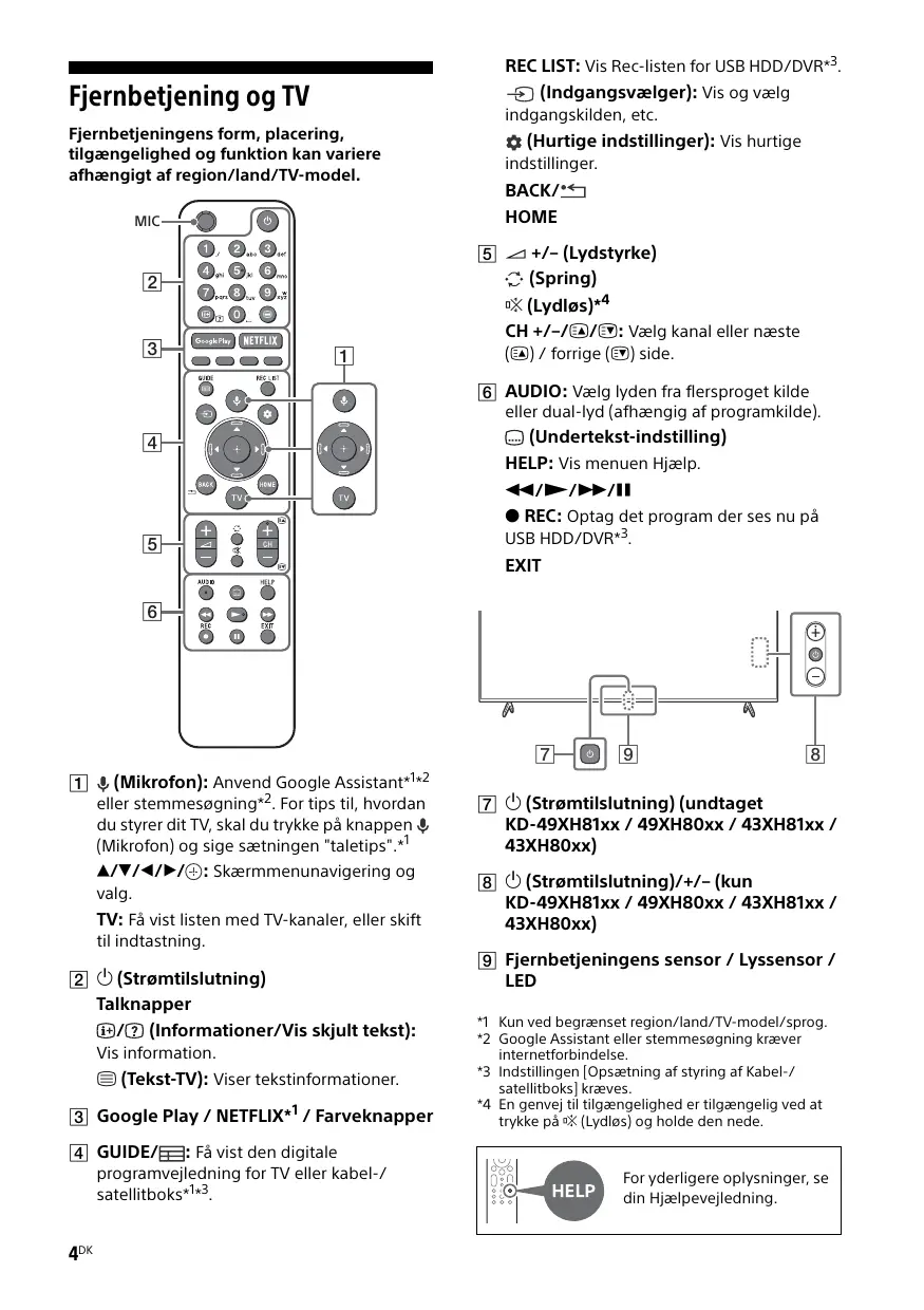 - Tryk på knappen HELP på fjernbetjeningen, og vælg Hjælpevejledning for at åbne den. VIGTIGT - Læs softwarelicensaftalen for slutbruger, før du anvender dit Sony-produkt. Anvendelse af dit produkt indikerer din accept af softwarelicensaftalen for slutbruger. Softwarelicensaftalen mellem dig og Sony er tilgængelig online på Sonys hjemmeside (http://www.sony.net/ tv-software-licenses/) eller på skærmen af dit produkt. Gå til [Indstillinger] [Enhedspræferencer] [Om] [Juridiske oplysninger] [Notater og licenser]. Bemærk