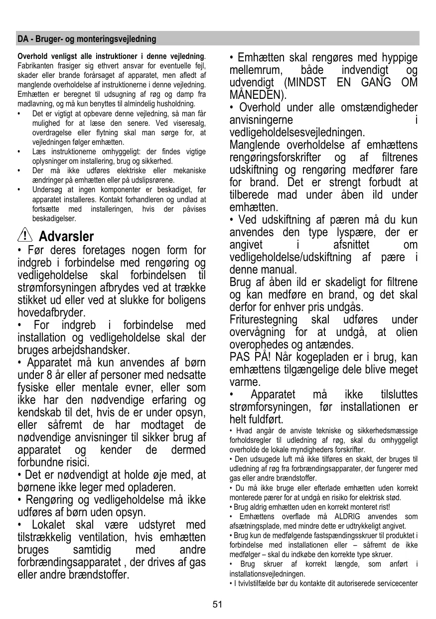 Overhold venligst alle instruktioner i dettevejledning. Fabrikanten frasiger sig ethvert ansvar for eventuelle fejl, skader eller brande forarssaget af apparatet, men afledt af manglende overholdelse af instruktionere i dettevejledning. Emhæten er beregnet til udsugning af røg og damp fra madlavning, og mA kun benyttes til almindelig husholdning.
