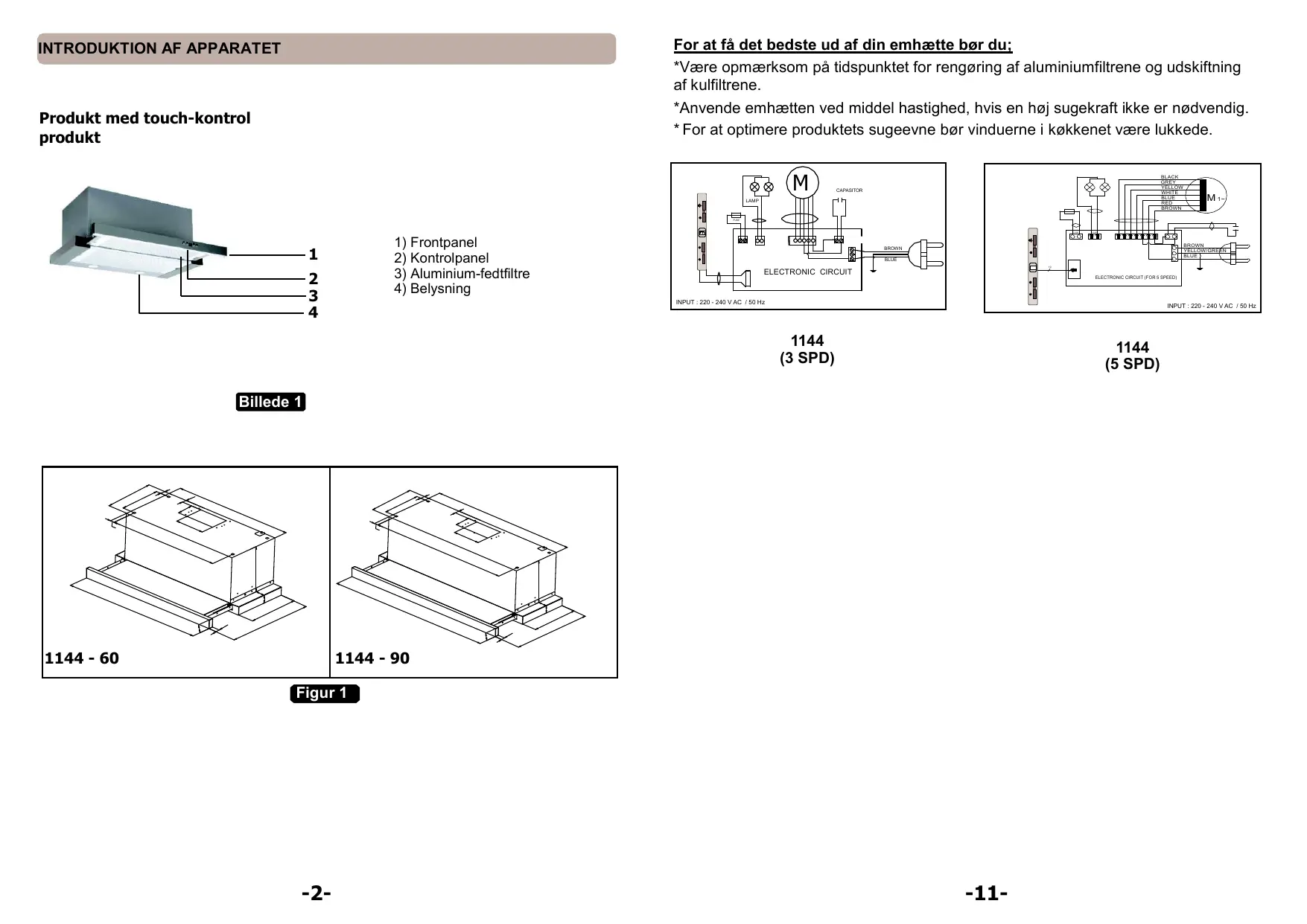 - Indpak dit produkt for at undgå skader. Installation og udpakning af produktet: *Kontrollér dit produkt for eventuelle skader. Anvendelse af 5 hastigheder Fjern den beskyttende folie på inox-produktet efter installation. Valg af hastighed Produktet har 9 ventilationshastigheder. Hastighedsniveau 1,2,3,4,5…9 vælges i forhold til omfanget af mados og damp. Motoren startes ved at trykke på ” ” kontroltasten på frontpanelet Hastigheden øges ved at trykke på ”+” tasten, og mindskes ved at trykke på ”” tasten. Automatisk timer (TIMER) er tilgængelig i modellerne med elektronisk fjernbetjening. . Når du holder ”O” tasten nede i mere end 2 sekunder, indstilles timerfunktionen til15 minutter. Når timeren er tændt, vil displayet give et signal, og motoren vil automatisk slukke efter 15 minutter. Sørg for at anvende komfuret og produktet på same tid for at muliggøre luftcirkulation. Ved at gøre dette påvirkes luftudsugningskraften positivt. Vi anbefaler, at du anvender dit produkt i få minutter mere efter endt madlavning, så resterende lugt og damp absorberes. *Skader, der er forårsaget under fragten, og fejl skal straks anmeldes til den fragtansvarlige. *Hvis du bemærker nogen skade, bedes du anmelde dette til sælger. *Lad ikke børn lege med emballagen!!! TOUCH-KONTROLPANEL Belysning Produktet har 2 lamper og en lampetast til at betjene belysningen. Tryk på lampetasten for at tænde lyset.