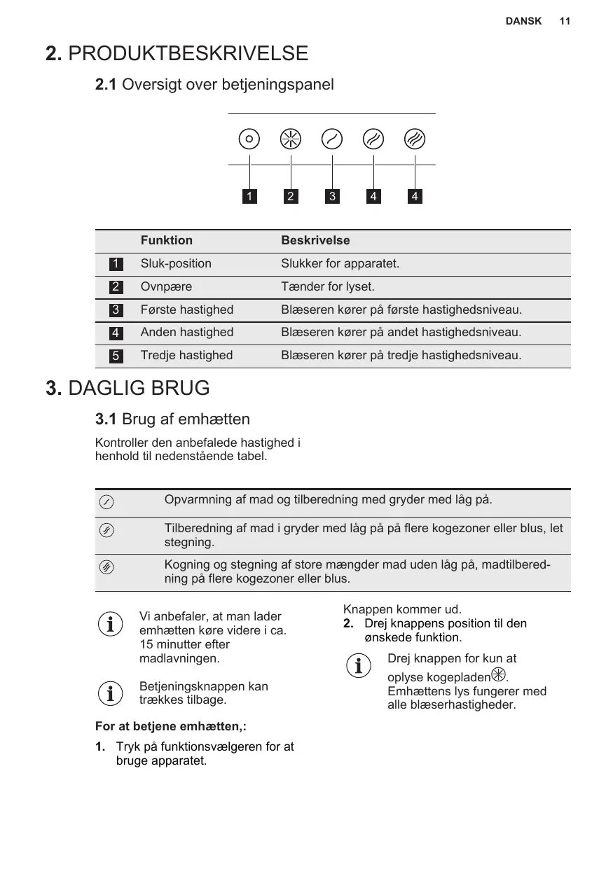 2. Modifiez la position de la manette selon la fonction souhaitée. Pour allumer uniquement la surface de cuisson, changez la position de la manette sur . L’éclairage de la hotte fonctionne avec toutes les fonctions de vitesse du ventilateur.