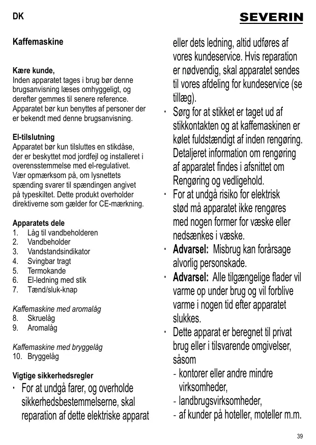 Kaffemaskine Kære kunde, Inden apparatet tages i brug bør denne brugsanvisning læses omhyggeligt, og derefter gemmes til senere reference. Apparatet bør kun benyttes af personer der er bekendt med denne brugsanvisning. El-tilslutning Apparatet bør kun tilsluttes en stikdåse, der er beskyttet mod jordfejl og installeret i overensstemmelse med el-regulativet. Vær opmærksom på, om lysnettets spænding svarer til spændingen angivet på typeskiltet. Dette produkt overholder direktiverne som gælder for CE-mærkning. Apparatets dele