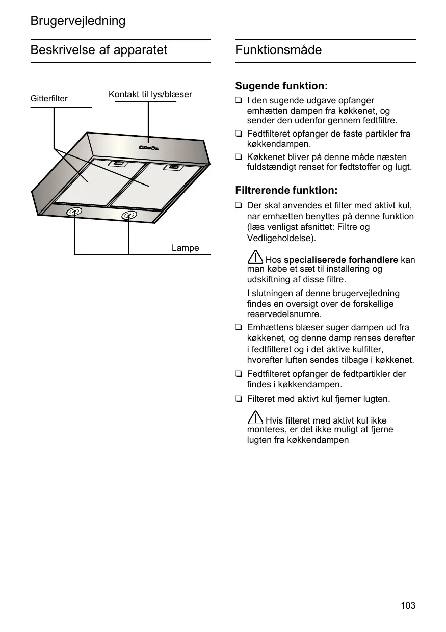 Filtrerende funktion: ❑ Der skal anvendes et filter med aktivt kul, når emhætten benyttes på denne funktion (læs venligst afsnittet: Filtre og Vedligeholdelse). Lampe Hos specialiserede forhandlere kan man købe et sæt til installering og udskiftning af disse filtre. I slutningen af denne brugervejledning findes en oversigt over de forskellige reservedelsnumre. ❑ Emhættens blæser suger dampen ud fra køkkenet, og denne damp renses derefter i fedtfilteret og i det aktive kulfilter, hvorefter luften sendes tilbage i køkkenet. ❑ Fedtfilteret opfanger de fedtpartikler der findes i køkkendampen. ❑ Filteret med aktivt kul fjerner lugten. Hvis filteret med aktivt kul ikke monteres, er det ikke muligt at fjerne lugten fra køkkendampen