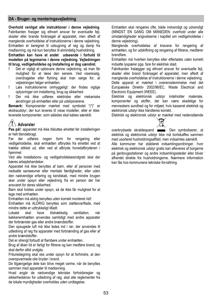 Overhold venligst alle instruktioner i dette vojledning. Fabrikanten frasiger sig ethvert ansvar for eventuelle fejl, skader erder brande forarssaget af apparatet, men afledt af manglende overholdelse af instruktionerne i dette vojledning. Emhætten er beregnet til udsugning af røg og damp fra madlavning, og på kun benyttes til almindelig husholdning.