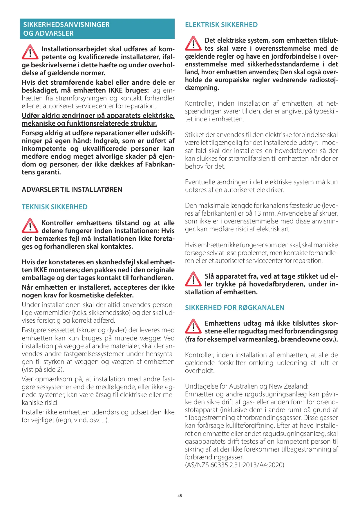 Avant l'installation de la hotte, s'assurer que toutes les normes en vigueur sur l’évacuation de l'air à l'extérieur de la pièce sont respectées. Déviation pour l’Australie et la Nouvelle Zélande: Les hottes de cuisine et les autres aspirateurs des fumées de cuisson peuvent nuire au bon fonctionnement des appareils qui brûlent du gaz ou d’autres combustibles (y compris ceux qui se trouvent dans d’autres pièces) en raison du reflux des gaz de combustion. Ces gaz peuvent potentiellement entraîner une intoxication au monoxyde de carbone. Après l’installation d’une hotte de cuisine ou d’un autre aspirateur des fumées de cuisson, le fonctionnement des appareils à gaz canalisé doit être testé par une personne compétente pour vérifier l’absence de reflux des gaz de combustion. (AS/NZS 60335.2.31:2013/A4:2020) 24