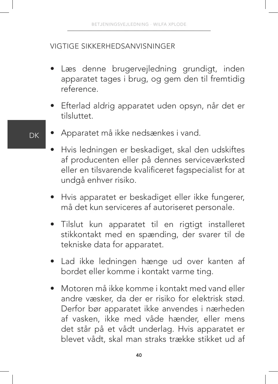 • Motoren må ikke komme i kontakt med vand eller andre væsker, da der er risiko for elektrisk stød. Derfor bør apparatet ikke anvendes i nærheden af vasken, ikke med våde hænder, eller mens det står på et vådt underlag. Hvis apparatet er blevet vådt, skal man straks trække stikket ud af
