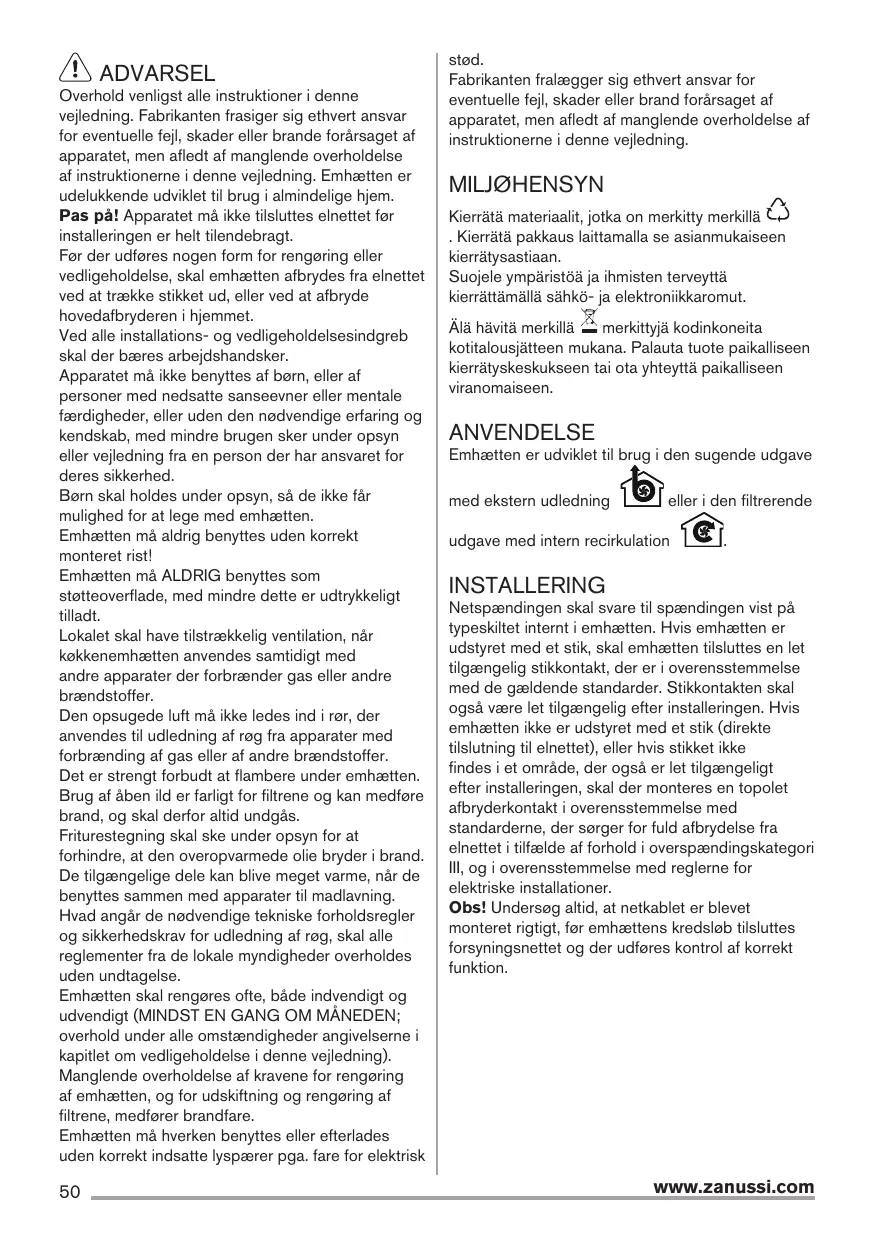 Téléchargez la notice de votre Køkkenemhætte au format PDF gratuitement ! Retrouvez votre notice ZHC92341XA - ZANUSSI et reprennez votre appareil électronique en main. Sur cette page sont publiés tous les documents nécessaires à l'utilisation de votre appareil ZHC92341XA de la marque ZANUSSI.