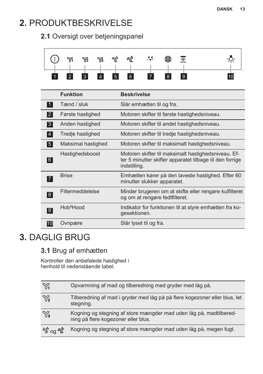Het wordt aanbevolen om de kap ongeveer 15 minuten na het koken aan te laten staan. Het bedieningspaneel is een sensorveld. Raak de symbolen gedurende 1 seconde aan om de functies in te schakelen. Om de kap: 1. Zet het apparaat aan door op het te drukken. symbool Je kunt nu de functies activeren. 2. Raak om de functie in te schakelen het symbool aan. De verlichting van de afzuigkappen werkt onafhankelijk van andere afzuigkapfuncties. Om het kookoppervlak te verlichten, raak je het lampje aan . Om de lichtintensiteit te wijzigen, houd je het symbool opnieuw ingedrukt. Om het apparaat uit te schakelen druk je opnieuw op het symbool 1. Trek aan de hendel van de filter onder de kap (1) en kantel de