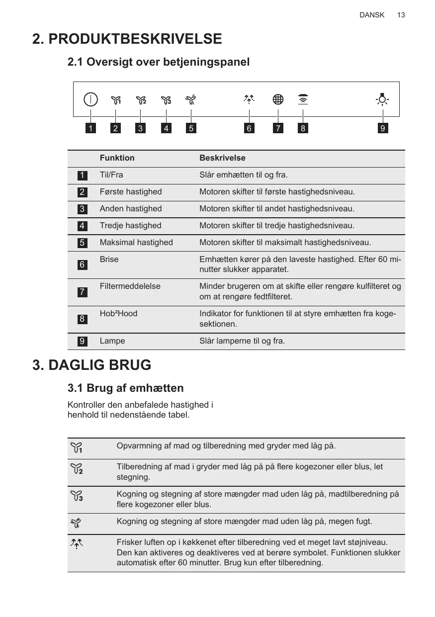 Kontroller den anbefalede hastighed i henhold til nedenstående tabel. Opvarmning af mad og tilberedning med gryder med låg på. Tilberedning af mad i gryder med låg på på flere kogezoner eller blus, let stegning. Kogning og stegning af store mængder mad uden låg på, madtilberedning på flere kogezoner eller blus. Kogning og stegning af store mængder mad uden låg på, megen fugt. Frisker luften op i køkkenet efter tilberedning ved et meget lavt støjniveau. Den kan aktiveres og deaktiveres ved at berøre symbolet. Funktionen slukker automatisk efter 60 minutter. Brug kun efter tilberedning.