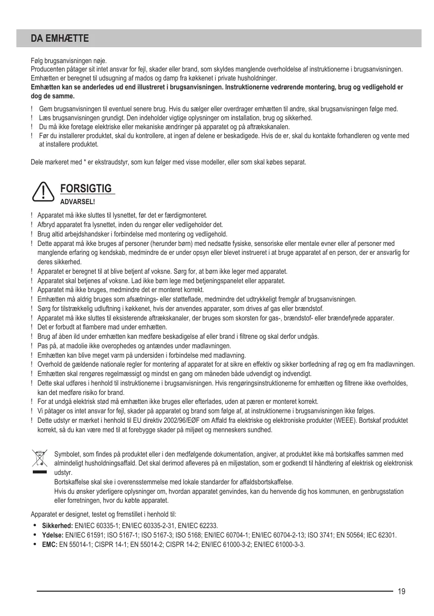 ! ! Cet appareil n’est pas prévu pour les enfants ou les personnes à capacités physiques, sensorielles ou mentales réduites ou manquant d’expérience et de connaissances. Elles ne pourront l’utiliser que sous la surveillance d'un adulte responsable de leur sécurité et après avoir été mises au courant de son fonctionnement. La hotte est prévue pour des adultes. Surveillez les enfants afin qu’ils ne jouent pas avec l’appareil ou avec ses commandes. Ne mettez jamais la hotte en marche si la grille n'est pas bien en place. Ne déposez AUCUN objet sur la hotte sauf si cela est expressément autorisé. Quand la hotte fonctionne en même temps que d'autres appareils à gaz ou autres combustibles, la cuisine doit disposer d'une ventilation suffisante. L'air aspiré par la hotte ne doit jamais être expulsé dans le conduit d’évacuation des fumées de combustion dégagées par des appareils fonctionnant au gaz ou autres combustibles. Il est formellement interdit de flamber les aliments sous la hotte. Évitez de laisser brûler une flamme nue sous la hotte, car cela peut endommager les filtres et provoquer un incendie. Surveillez vos fritures en permanence, car la graisse ou l’huile surchauffée peut prendre feu. Les parties accessibles de la hotte peuvent devenir assez chaudes quand les appareils de cuisson sont en marche. En ce qui concerne les mesures techniques de sécurité pour l'évacuation des fumées, respectez strictement les réglementations et normes en vigueur dans votre pays. La hotte doit être régulièrement nettoyée, aussi bien à l'intérieur qu'à l'extérieur (AU MOINS UNE FOIS PAR MOIS), et ceci en respectant les instructions d'entretien fournies dans ce manuel. Le non-respect des consignes concernant le nettoyage de la hotte ainsi que le remplacement et le nettoyage des filtres peut entraîner un risque d'incendie. Afin d'éviter tout risque de choc électrique, n'utilisez pas la hotte si les lampes ne sont pas bien en place. Nous déclinons toute responsabilité pour tout dysfonctionnement, dommage ou incendie résultant du non-respect des consignes figurant dans cette notice. Ce symbole figure sur le produit ou sur son emballage en application de la directive européenne 2002/96/CE sur les Déchets d’Équipement Électrique et Électronique (DEEE). Cette directive sert de règlement cadre à la reprise, au recyclage et à la valorisation des appareils usagés dans toute l’Europe. Ce produit doit donc faire l’objet d’une collecte sélective. Lorsque vous ne l’utiliserez plus, remettez-le à un service de ramassage spécialisé ou à une déchèterie qui traite les DEEE ; vous contribuerez ainsi à éviter des conséquences néfastes pour la santé et l'environnement. Pour tout renseignement sur la mise au rebut et le recyclage de ce produit, veuillez contacter la mairie ou le service de la propreté de votre commune, ou encore le magasin dans lequel vous l'avez acheté.