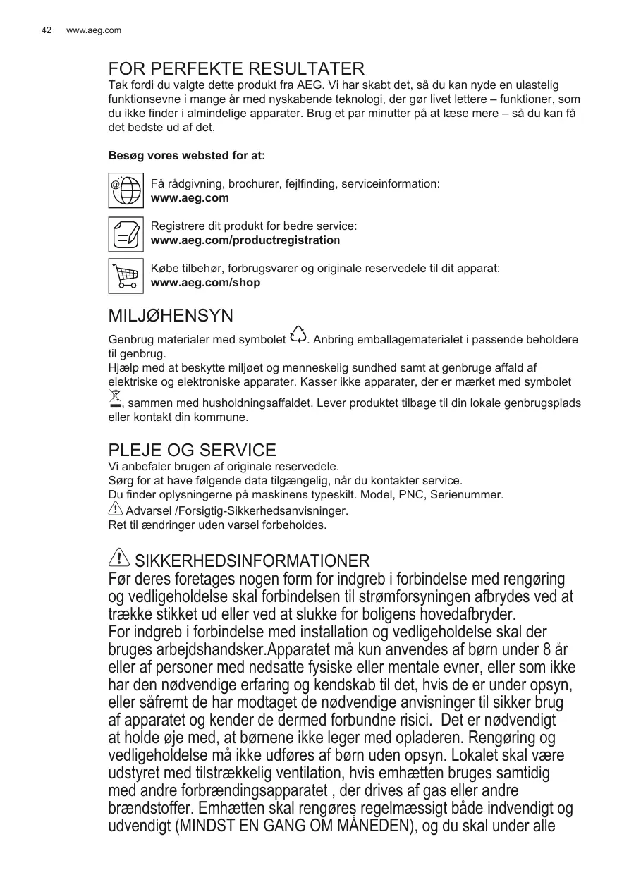 FOR PERFEKTE RESULTATER Tak fordi du valgte dette produkt fra AEG. Vi har skabt det, så du kan nyde en ulastelig funktionsevne i mange år med nyskabende teknologi, der gør livet lettere – funktioner, som du ikke finder i almindelige apparater. Brug et par minutter på at læse mere – så du kan få det bedste ud af det. Besøg vores websted for at: Få rådgivning, brochurer, fejlfinding, serviceinformation: www.aeg.com Registrere dit produkt for bedre service: www.aeg.com/productregistration Købe tilbehør, forbrugsvarer og originale reservedele til dit apparat: www.aeg.com/shop