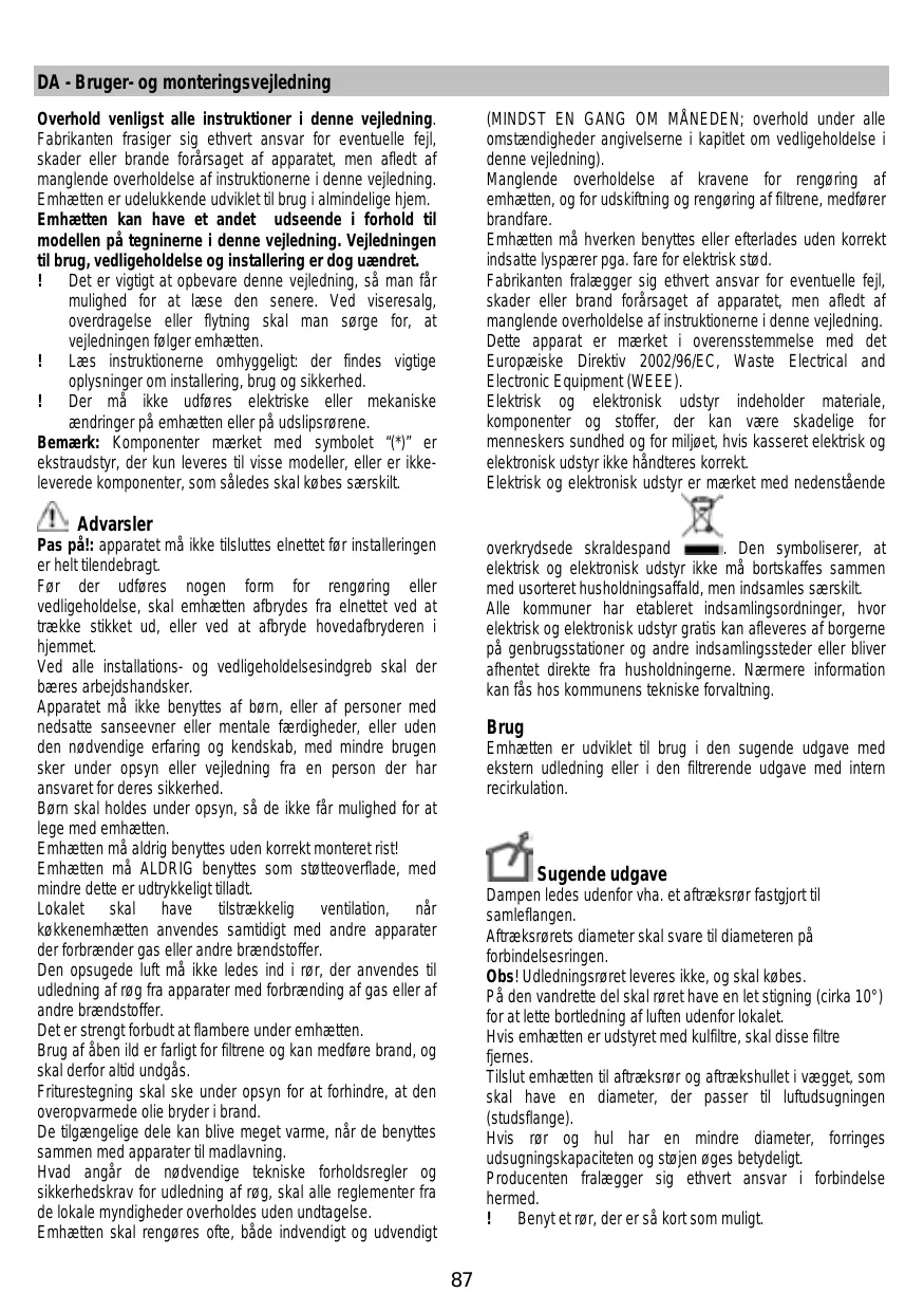 Montaje y modo de empleo Instruções para montagem e utilização ΟΔΗΓΙΕΣ ΣΥΝΑΡΜΟΛΟΓΗΣΗΣ ΚΑΙ ΧΡΗΣΗΣ En ce qui concerne les mesures techniques et de sécurité à adopter pour l’évacuation des fumées, s’en tenir strictement à ce qui est prévu dans les règlements des autorités locales compétentes. La hotte doit être régulièrement nettoyée, aussi bien à l’intérieur qu’à l’extérieur (AU MOINS UNE FOIS PAR MOIS, respecter néanmoins les instructions relatives à l’entretien fournies dans ce manuel). La non observation de ces normes de nettoyage de la hotte et du changement et nettoyage des filtres comporte des risques d’incendie. Ne pas utiliser ou laisser la hotte sans que les ampoules soient correctement placées pour éviter tout risque de choc électrique. La société décline toute responsabilité pour d’éventuels inconvénients, dégâts ou incendies provoqués par l’appareil et dérivés de la non observation des instructions reprises dans ce manuel. Cet appareil porte le symbole du recyclage conformément à la Directive Européenne 2002/96/CE concernant les Déchets d’Équipements Électriques et Électroniques (DEEE ou WEEE). En procédant correctement à la mise au rebut de cet appareil, vous contribuerez à empêcher toute conséquence nuisible pour l’environnement et la santé de l’homme.