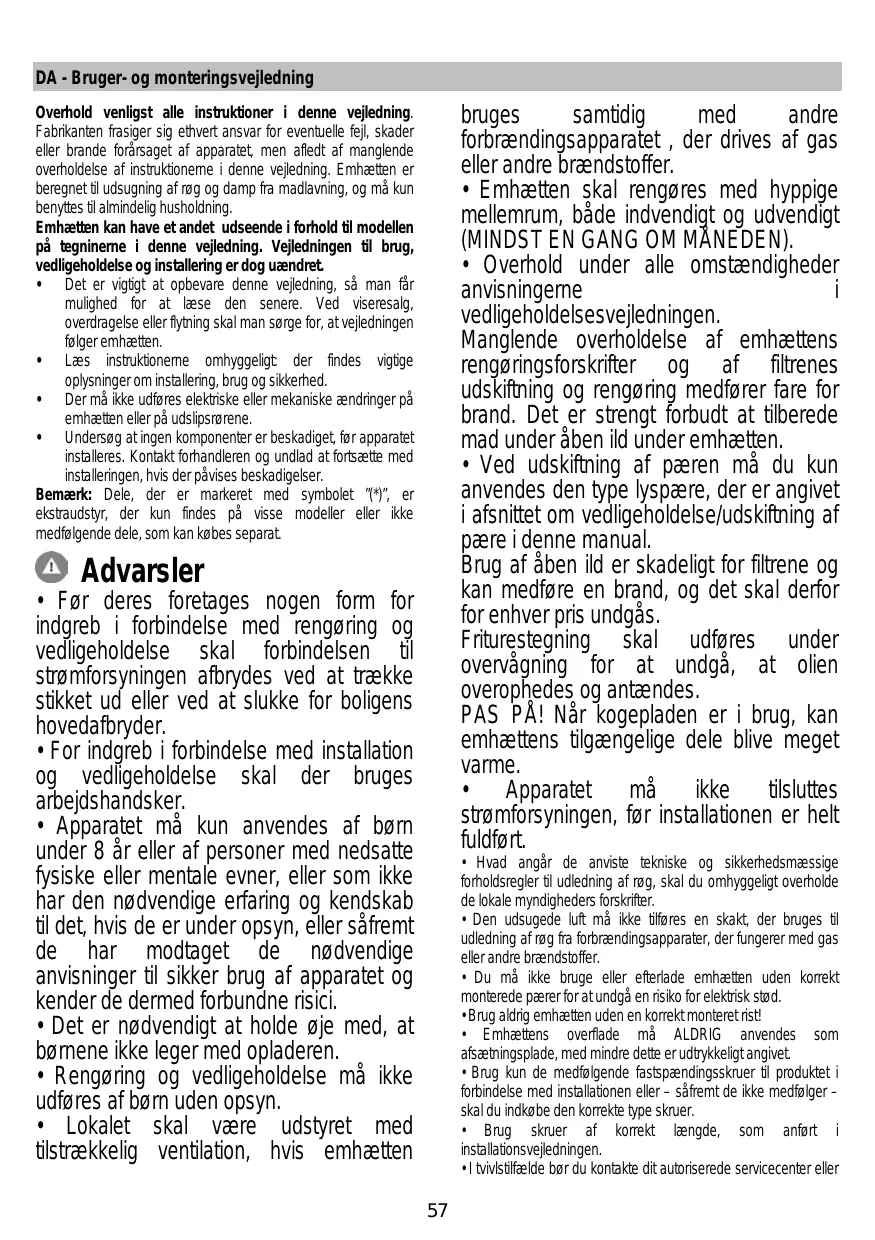 • La hotte doit être régulièrement nettoyée à la fois à l'intérieur et à l'extérieur (AU MOINS UNE FOIS PAR MOIS); cela devrait se faire en conformité avec les instructions d'entretien. Le non respect des instructions expressément fournies concernant le nettoyage de la hotte et des filtres peut provoquer des risques d'incendie. • Ne pas flamber d’aliments sous la hotte. • Pour le remplacement de la lampe, utilisez uniquement le type de lampe spécifié dans la section remplacement/maintenance lampe dans ce manuel. L'utilisation d'une flamme nue est dommageable pour les filtres et peut causer un incendie, par conséquent, il est déconseillé de l'utiliser. La friture doit être faite avec soin afin de s’assurer que l’huile surchauffée ne prenne pas feu. AVERTISSEMENT: Lorsque la table de cuisson est en fonctionnement, les parties accessibles de la hotte peuvent devenir très chaudes. • Ne pas brancher l'appareil au réseau électrique avant que l'installation ne soit complètement terminée.