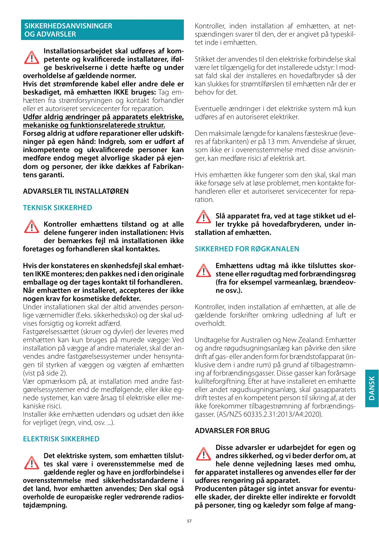 SÉCURITÉ ÉVACUATION DES FUMÉES Ne pas raccorder l'appareil aux conduits d'évacuation des fumées produites par la combustion (par ex. chaudières, cheminées, etc.)