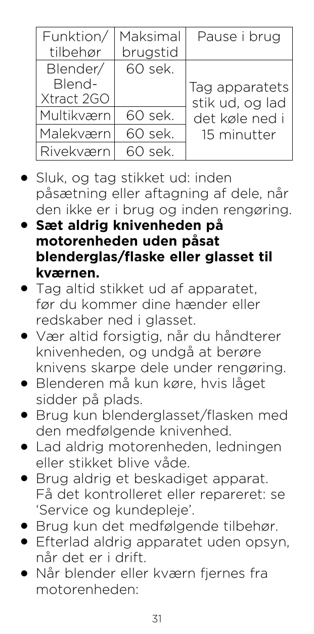 Blender/ Moulin à 60 sec refroidir râper pendant 15 minutes Éteignez et débranchez l’appareil avant le montage ou le démontage de pièces, lorsqu’il n’est pas utilisé ou avant le nettoyage. N’installez jamais l’unité portelames sur le bloc moteur sans que le gobelet/la bouteille du blender ou 10