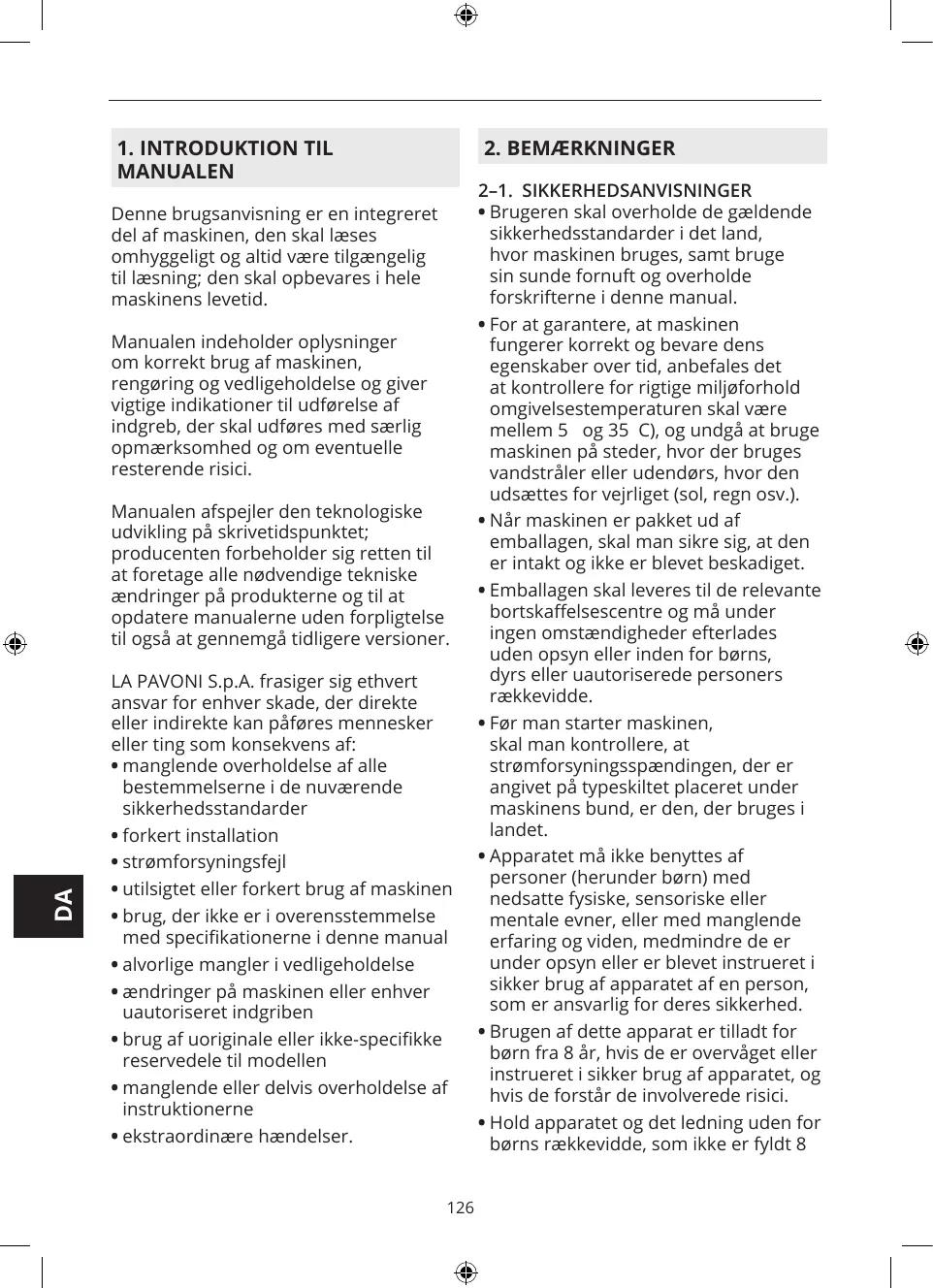 Manualen afspejler den teknologiske udvikling på skrivetidspunktet; producenten forbeholder sig retten til at foretage alle nødvendige tekniske ændringer på produkterne og til at opdatere manualerne uden forpligtelse til også at gennemgå tidligere versioner. LA PAVONI S.p.A. frasiger sig ethvert ansvar for enhver skade, der direkte eller indirekte kan påføres mennesker eller ting som konsekvens af: