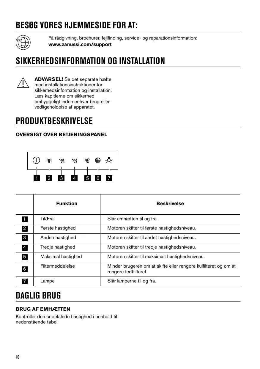 SIKKERHEDSINFORMATION OG INSTALLATION ADVARSEL! Se det separate hæfte med installationsinstruktioner for sikkerhedsinformation og installation. Læs kapitlerne om sikkerhed omhyggeligt inden enhver brug eller vedligeholdelse af apparatet.