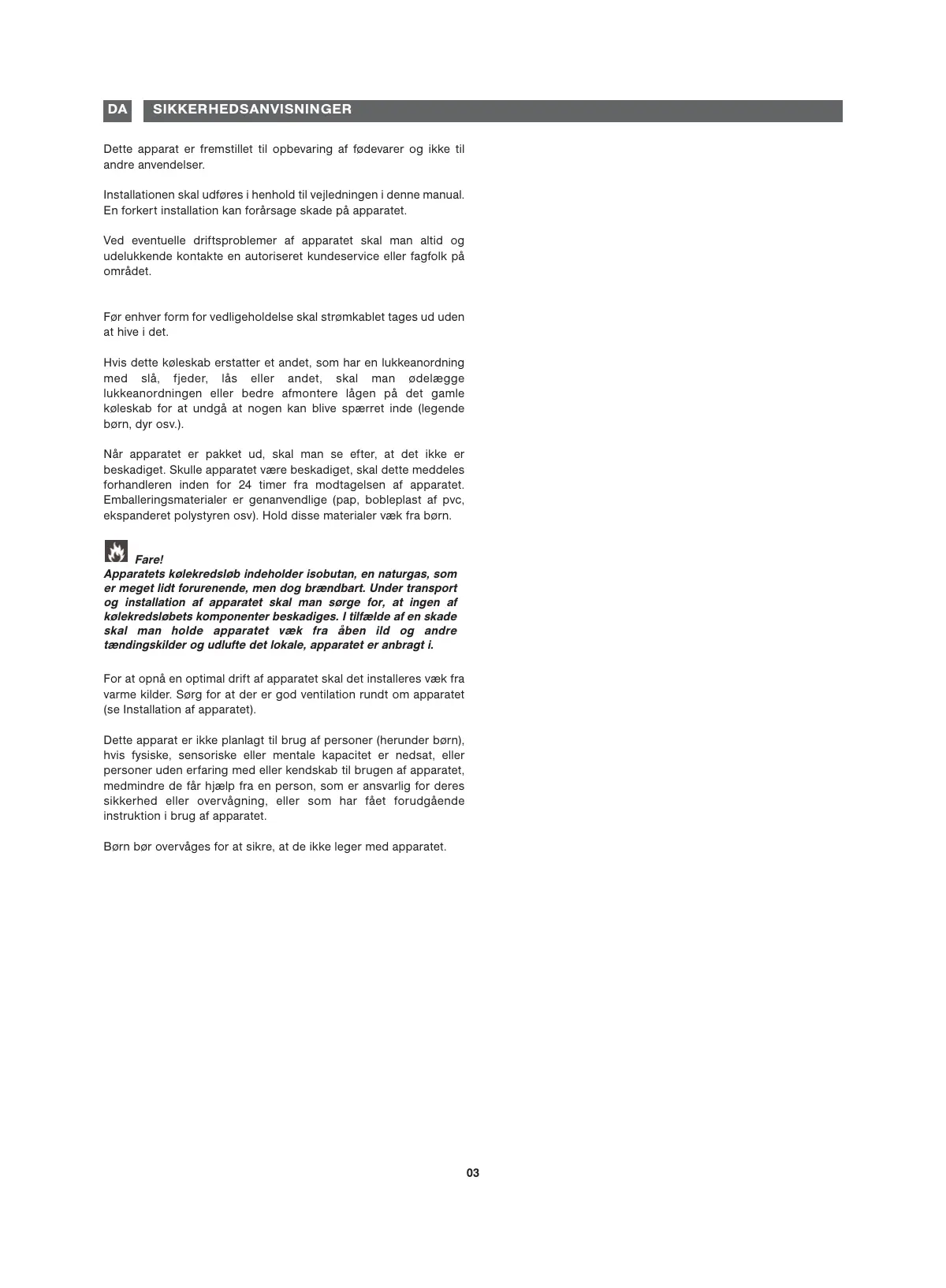 Le circuit de réfrigération de l'appareil renferme de l'isobutane réfrigérant, un gaz naturel peu polluant mais néanmoins inflammable. Pendant le transport et l'installation de l'appareil, assurez-vous qu'aucun des composants du circuit de réfrigération n'est endommagé. En cas de dommage, le laisser à l'écart des flammes et des sources d'inflammation et bien aérer la pièce où il se trouve.