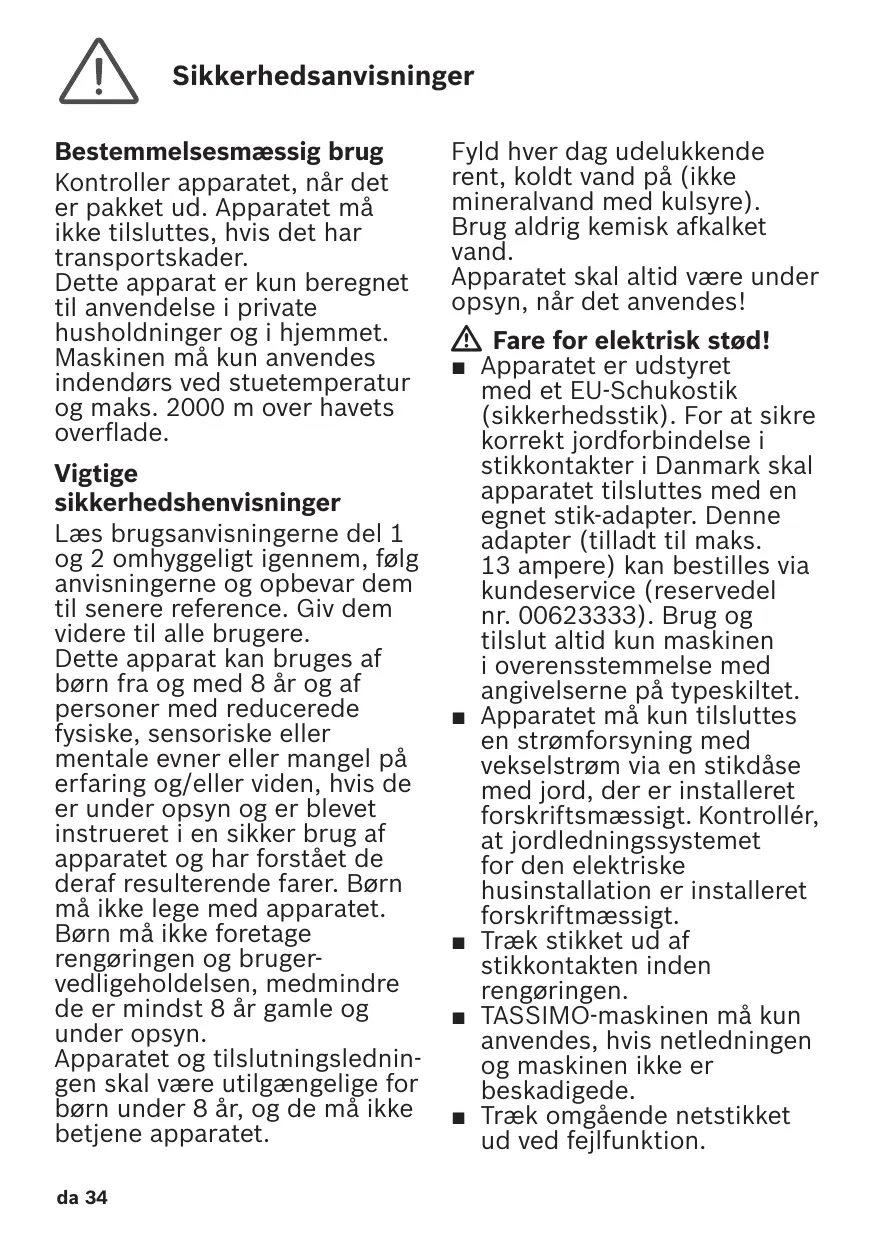 Fyld hver dag udelukkende rent, koldt vand på (ikke mineralvand med kulsyre). Brug aldrig kemisk afkalket vand. Apparatet skal altid være under opsyn, når det anvendes! W Fare for elektrisk stød! ■ Apparatet er udstyret med et EUSchukostik (sikkerhedsstik). For at sikre korrekt jordforbindelse i stikkontakter i Danmark skal apparatet tilsluttes med en egnet stikadapter. Denne adapter (tilladt til maks. 13 ampere) kan bestilles via kundeservice (reservedel nr. 00623333). Brug og tilslut altid kun maskinen i overensstemmelse med angivelserne på typeskiltet. ■ Apparatet må kun tilsluttes en strømforsyning med vekselstrøm via en stikdåse med jord, der er installeret forskriftsmæssigt. Kontrollér, at jordledningssystemet for den elektriske husinstallation er installeret forskriftmæssigt. ■ Træk stikket ud af stikkontakten inden rengøringen. ■ TASSIMOmaskinen må kun anvendes, hvis netledningen og maskinen ikke er beskadigede. ■ Træk omgående netstikket ud ved fejlfunktion.
