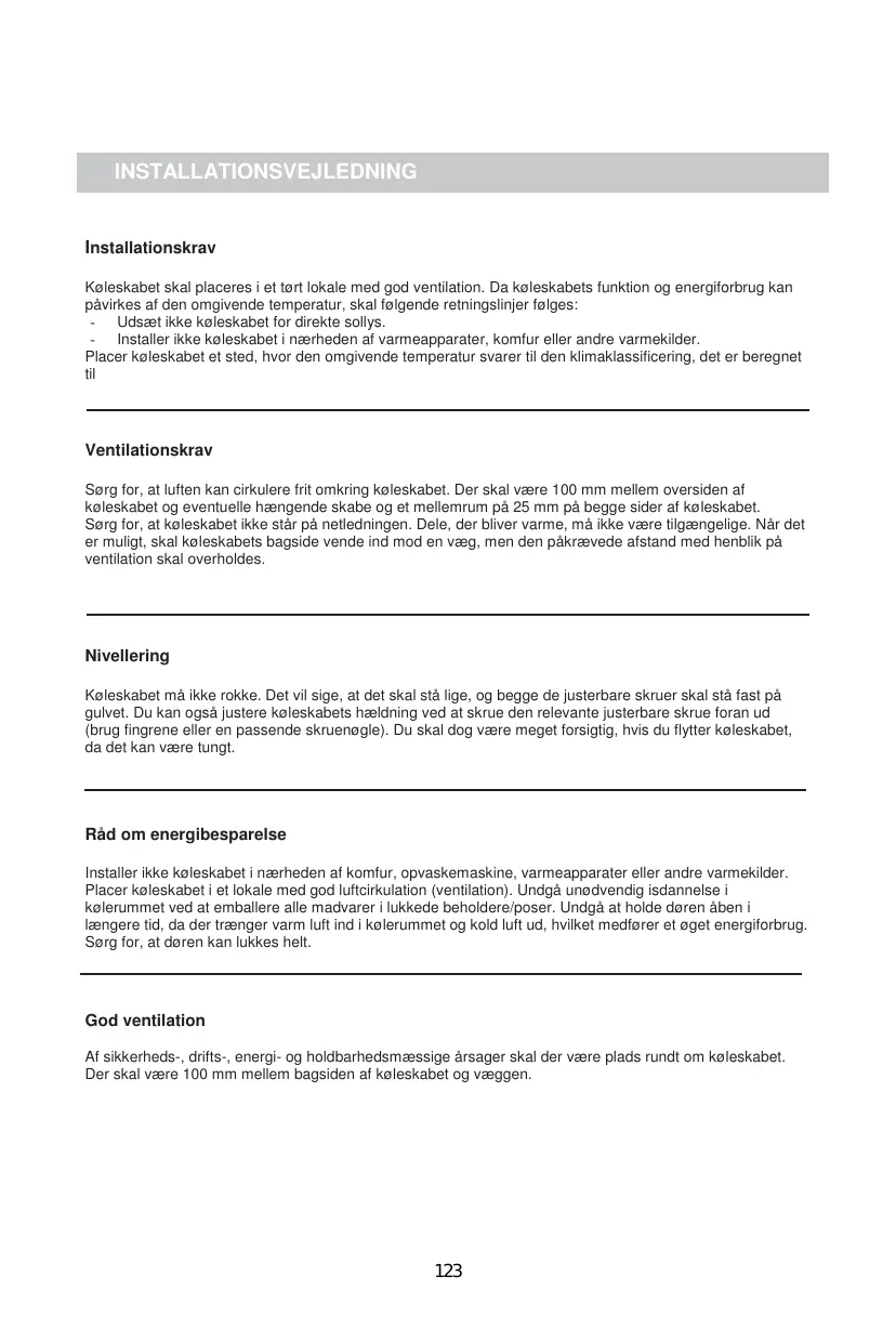 La surface sur laquelle le réfrigérateur est positionné doit être parfaitement plate et solide. Il ne doit absolument pas être posé sur une surface instable. Les pieds de l'appareil vous permettent d'ajuster sa hauteur à souhait. Ne pas placer le réfrigérateur à proximité d’un appareil émettant des vibrations.