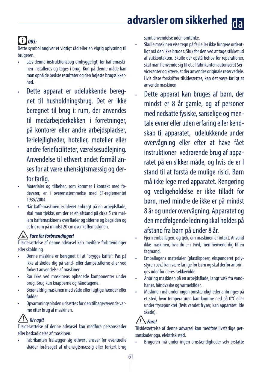 Les matières et les objets destinés au contact avec des produits alimentaires sont conformes au règlement européen 1935/2004. • Après avoir placé l’appareil sur le plan de travail, veillez à ce qu’il reste un espace d’environ 5 cm tout autour de la machine à café et de 20 cm au moins au-dessus. Danger Brûlures ! Risque de brûlures. • Cet appareil est fabriqué pour “faire du café”. Attention aux brûlures causées par les projections d’eau chaude ou de vapeur ou par une mauvaise utilisation de l’appareil. • Pendant l’utilisation ne touchez pas les surfaces chaudes de l’appareil. Ne touchez que les boutons ou les poignées. • Évitez de toucher l’appareil les mains ou les pieds mouillés ou humides. • La plaque chauffante reste chaude après l’utilisation de l’appareil. Attention ! Le non-respect de ces consignes peut provoquer des blessures ou endommager l’appareil. • Le fabricant ne peut être tenu pour responsable des dommages éventuellement causés par une mauvaise utilisation ou une utilisation non conforme aux instructions. • En cas de panne ou de mauvais fonctionnement de l’ap-