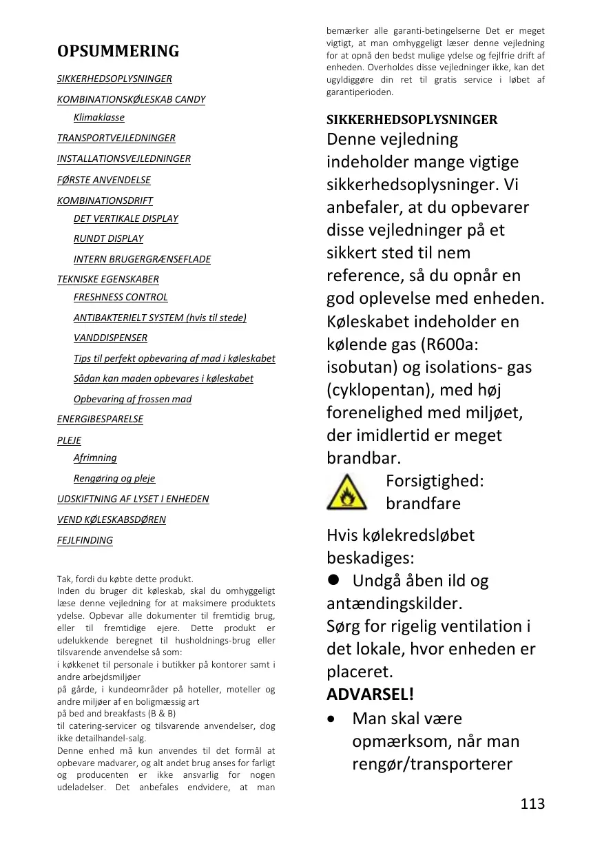 Nous vous suggérons de conserver ces instructions dans un endroit sûr pour une référence ultérieure aisée et une bonne utilisation de l’appareil. Ce réfrigérateur contient un gaz réfrigérant (R600a : isobutane) et un gaz isolant (cyclopentane), qui présentent une compatibilité élevée avec l'environnement mais des propriétés inflammables. Attention : risque d'incendie En cas de dommages du circuit de réfrigérant : Éviter des flammes ouvertes et des sources d'inflammation. Bien aérer la pièce dans 26