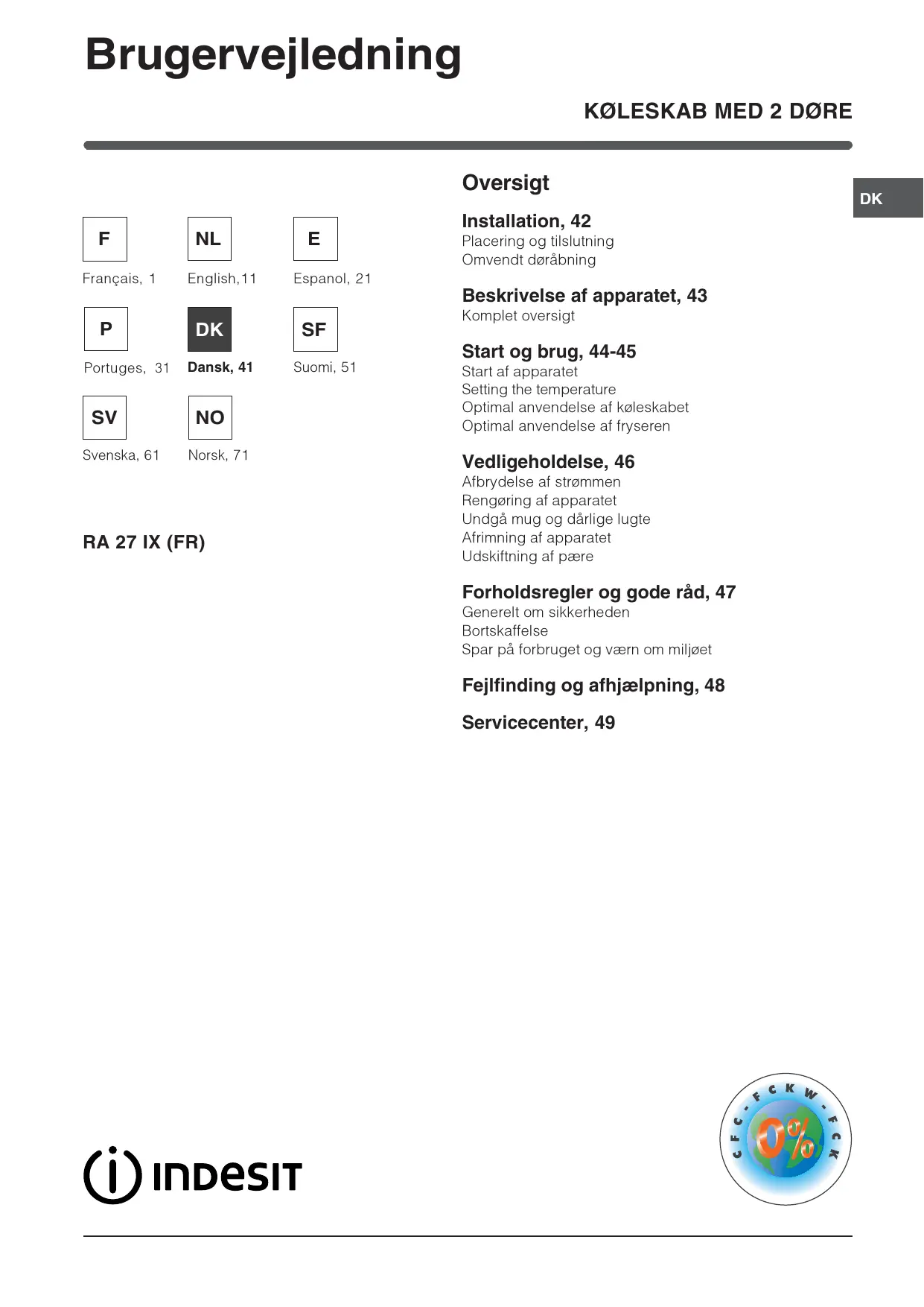 RA27 - Køleskab INDESIT - Notice d'utilisation et mode d'emploi gratuit