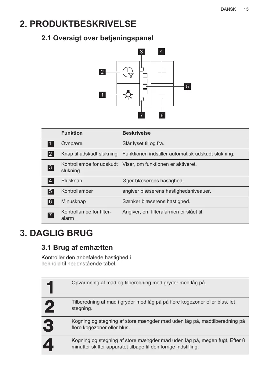 3. DAGLIG BRUG 3.1 Brug af emhætten Kontroller den anbefalede hastighed i henhold til nedenstående tabel. Opvarmning af mad og tilberedning med gryder med låg på. Tilberedning af mad i gryder med låg på på flere kogezoner eller blus, let stegning. Kogning og stegning af store mængder mad uden låg på, madtilberedning på flere kogezoner eller blus. Kogning og stegning af store mængder mad uden låg på, megen fugt. Efter 8 minutter skifter apparatet tilbage til den forrige indstilling.