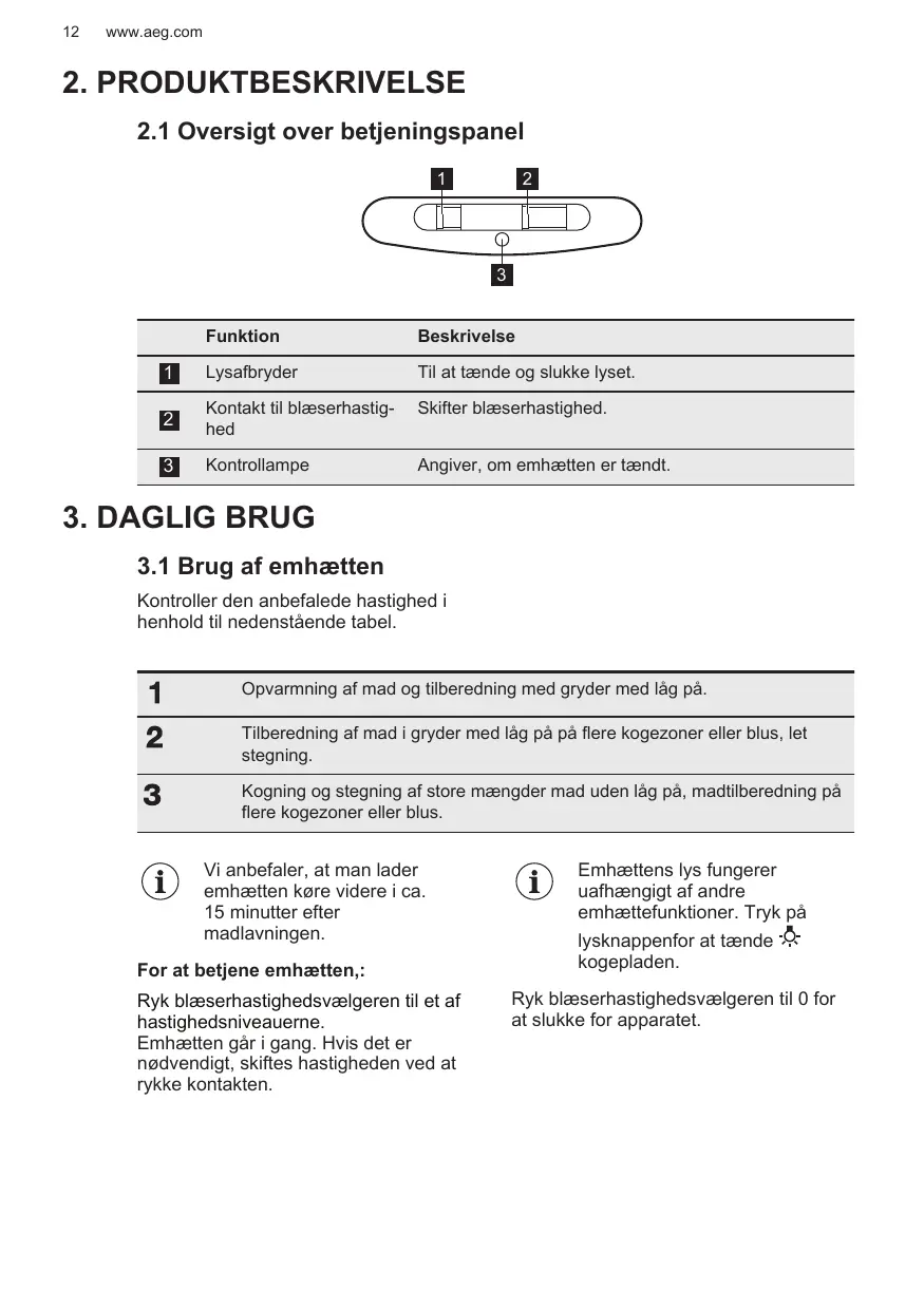 15 minutos después de cocinar. Para utilizar la campana: Mueva el selector de velocidad del ventilador a uno de los niveles de velocidad. La campana empieza a funcionar. Si es necesario, cambie la velocidad moviendo el interruptor.