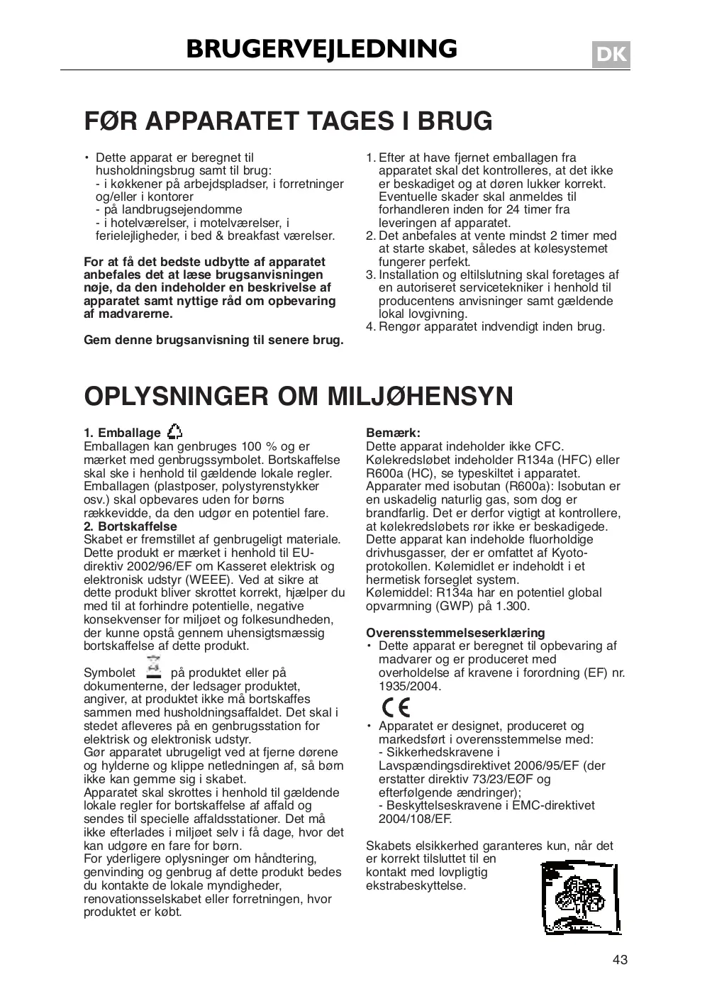 Le symbole apposé apposé sur l’appareil ou sur documentation qui l’accompagne indique que documentation qui l’accompagne indique quecece produit ne peut en aucun cascas être traité comme produit ne peut en aucun être traité commeunun déchet ménager. Il doit parpar conséquent déchet ménager. Il doit conséquentêtre êtreremis remis à à unun centre dedecollecte du centre collectedes desdéchets déchets chargé chargé du recyclage des équipements électriques et recyclage des équipements électriques et électroniques. Au Au moment de la la mise au rebut, électroniques. momentendesectionnant mise au rebut, rendez l’appareil inutilisable le lecâble rendez l’appareil inutilisable en sectionnant câ ble d’alimentation et en démontant les portes et les d’alimentation et en démontant les portes et les grilles, de façon à ce que les enfants ne puissent pas grilles, de façon àà ce que les enfants ne puissent pas accéder facilement l’intérieur de celui-ci. à l’intérieurles denormes celui-ci.locales Pour la Pouraccéder la misefacilement au rebut, respectez mise auetrebut, respectez les normes locales de en en vigueur remettez l’appareil à un centre vigueur et remettez l’appareil à un l’appareil centre de sans collecte spécialisé. Ne laissez jamais collecte spécialisé. jamais l’appareil surveillance, ne fut-ce Ne quelaissez quelques jours, car ilsans surveillance, ne fut-ce quelques car il représente une source deque danger pourjours, les enfants. source de détails danger au pour les du enfants. Pourreprésente obtenir deune plus amples sujet Pour obtenir plus amples et détails au sujet du traitement, de la de récupération du recyclage de traitement, de la récupération et au du bureau recyclage de cet appareil, veuillez vous adresser cet appareil, veuillez vous adresser au bureau compétent de votre commune, à la société locale compétent votre ménagers commune, ou à ladirectement société localeà de collecte des de déchets collecte des . déchets ménagers ou directement à votrederevendeur votre revendeur.