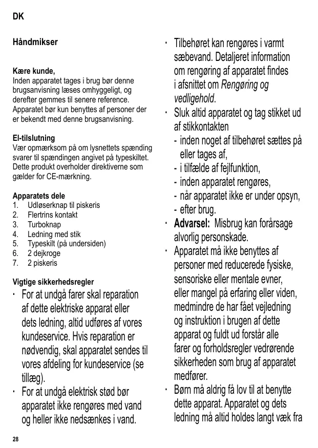 ∙ Verwijder altijd de stekker uit het stopcontact voordat men het apparaat schoonmaakt. ∙ Om elektrische schokken te voorkomen maak het apparaat nooit schoon met water en dompel het nooit onder. ∙ De huizing mag schoongeveegd worden met een pluisvrije vochtige doek. ∙ De kloppers en deeghaken mogen schoongemaakt worden in heet water en zeep. Deze onderdelen zijn niet vaatwasmachine veilig. Cuando se emplean las velocidades 1 - 5, no se debe hacer funcionar la unidad durante más de 4 minutos ininterrumpidamente. Después apague la batidora y deje que se enfríe el motor. Control de velocidades ∙ La batidora está dotada de un interruptor multiprocesador. ∙ Dispone de los siguientes niveles: 0 La unidad está apagada 1 muy baja velocidad 2 baja velocidad ∙ Tomando en cuenta la cantidad de ingredientes, escoja un recipiente adecuadamente profundo. ∙ Puede utilizar cualquier recipiente, contenedor redondo o vaso, siempre que sea resistente a rasguños y que los accesorios puedan girar libremente en su interior. ∙ Después de acoplar el accesorio, agarre la batidora e introduzca el accesorio en el recipiente donde están los ingredientes. ∙ Utilice el pulgar para poner la unidad en marcha. ∙ Al terminar la mezcla o si desea interrumpir la operación, apague el aparato antes de extraer el accesorio de la mezcla. 22