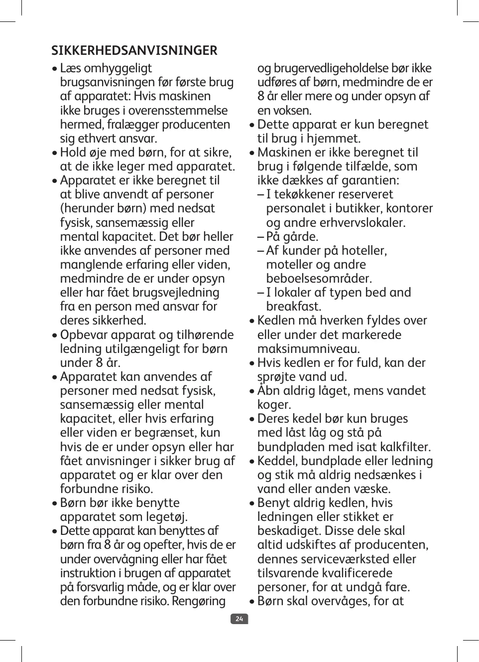 Au fur et à mesure qu’ils grandissent, apprenez à vos enfants à faire attention aux liquides chauds pouvant se trouver dans une cuisine. Placez bouilloire et cordon bien à l’arrière du plan de travail, hors de portée des enfants. Si un accident se produit, passez de l’eau froide immédiatement sur la brûlure et appelez un médecin si nécessaire. • Afin d’éviter tout accident : ne portez pas votre enfant ou bébé lorsque vous buvez ou transportez une boisson chaude.
