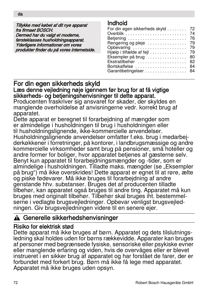Tillykke med købet af dit nye apparat fra firmaet BOSCH. Dermed har du valgt et moderne, førsteklasses husholdningsapparat. Yderligere informationer om vores produkter finder du på vores internetside. Indhold For din egen sikkerheds skyld . . . . . . . . Overblik . . . . . . . . . . . . . . . . . . . . . . . . . Betjening . . . . . . . . . . . . . . . . . . . . . . . . Rengøring og pleje . . . . . . . . . . . . . . . . Opbevaring . . . . . . . . . . . . . . . . . . . . . . Hjælp i tilfælde af fejl . . . . . . . . . . . . . . . Eksempler på brug . . . . . . . . . . . . . . . . Ekstratilbehør . . . . . . . . . . . . . . . . . . . . Bortskaffelse . . . . . . . . . . . . . . . . . . . . . Garantibetingelser . . . . . . . . . . . . . . . . .